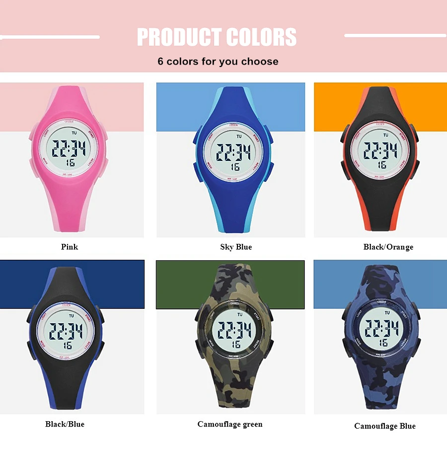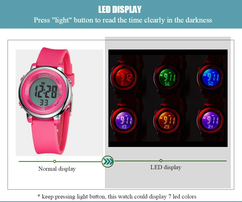 -Новая модель высокого качества-Цифровой: час, минута, секунда, pm, месяц, дата, день-Формат 12/24 часов-Будильник и функция ежечасного звонка-Специальная конструкция с хронограф (секундомер) при температуре не выше 0,01 второй шаг-Дополнительные 7 цветов ЖК-светильник для отображения времени четко в темноте-Глубина водонепроницаемости до 50 м (не нажимайте кнопку в воде)