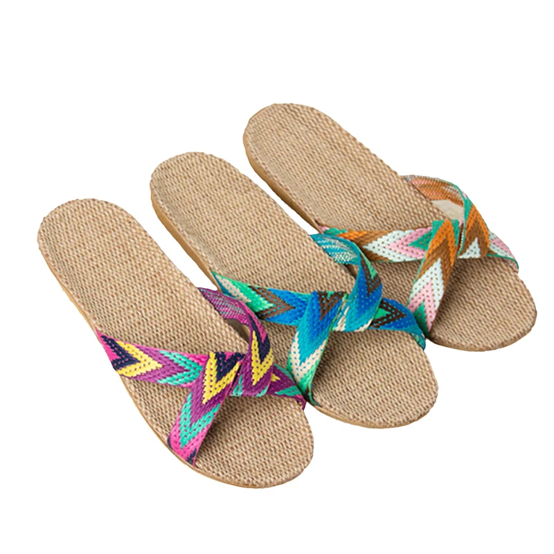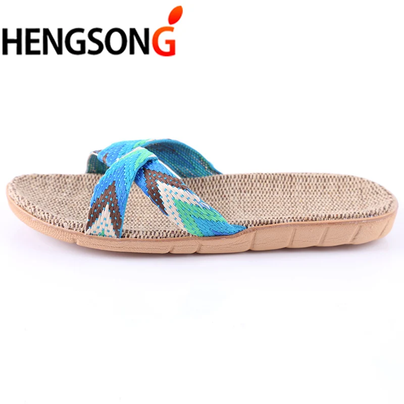 Модные льняные домашние тапочки, домашняя обувь, обувь для пола с перекрестными ремнями, бесшумные тапки от пота для лета, женские сандалии