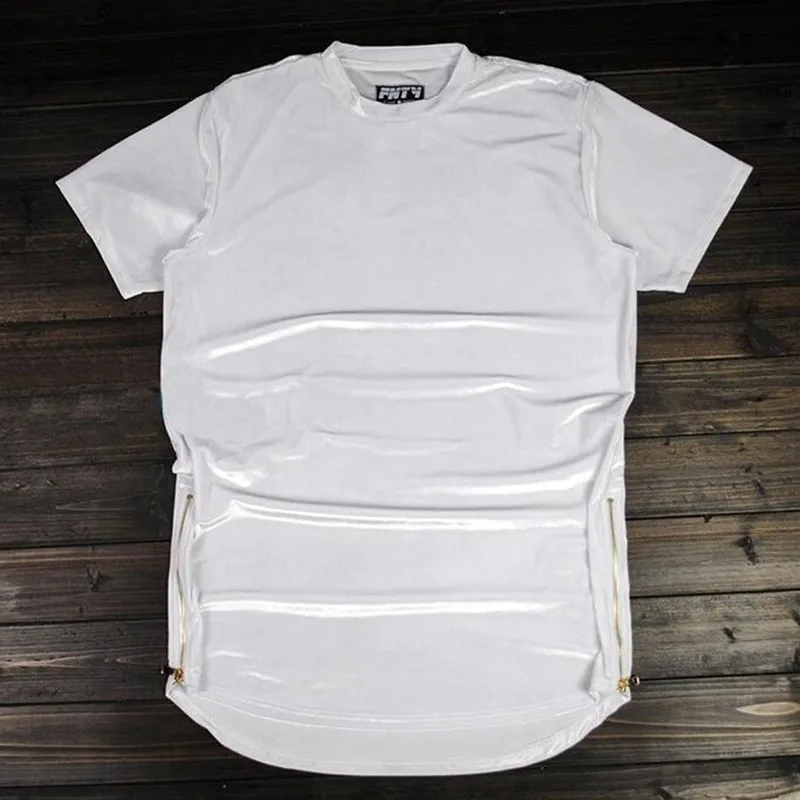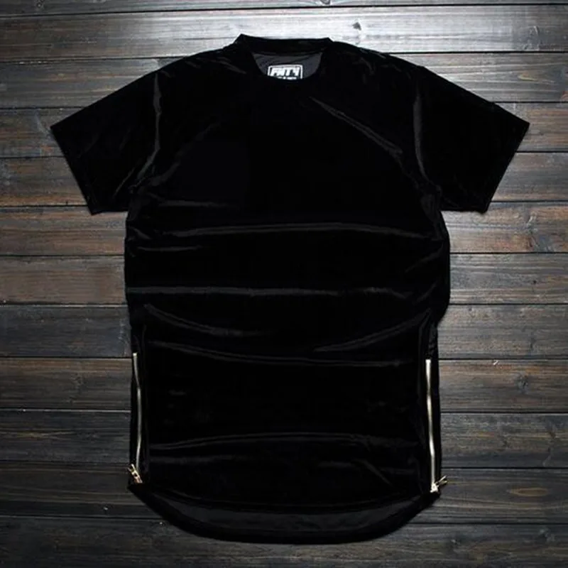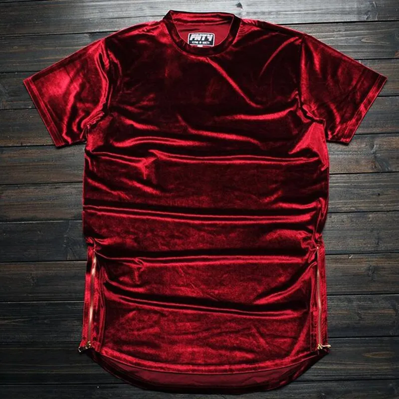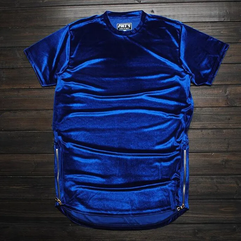 MORUANCLE Новая мода Хай-стрит мужчины Расширенный рубашка велюр удлиненная в стиле "хип-хоп", футболки золотистого цвета с боковой молнией, из бархата с закругленным краем, одежда, футболка