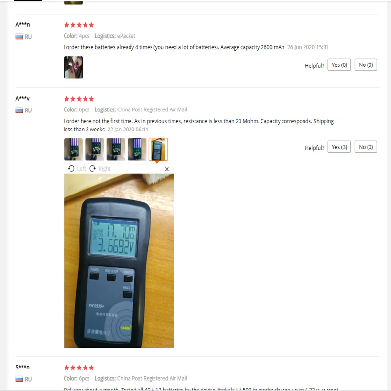 Батарейки в среднем 2600 мач 10 сопротивление, продавец отправил 80 штук двумя посылками одна дошла за 55 дней другая за 63. Долго. Решайте сами покупать или нет.