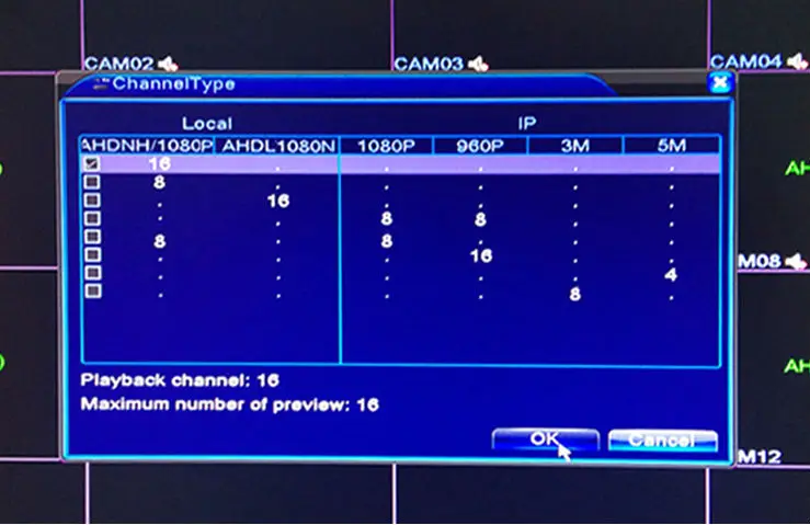 Локальный аналоговый вход: 16 * AHD 1080P 960P 720 P