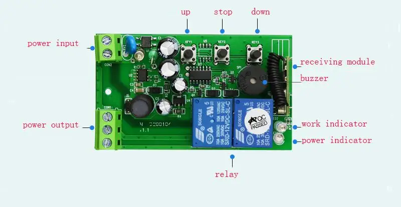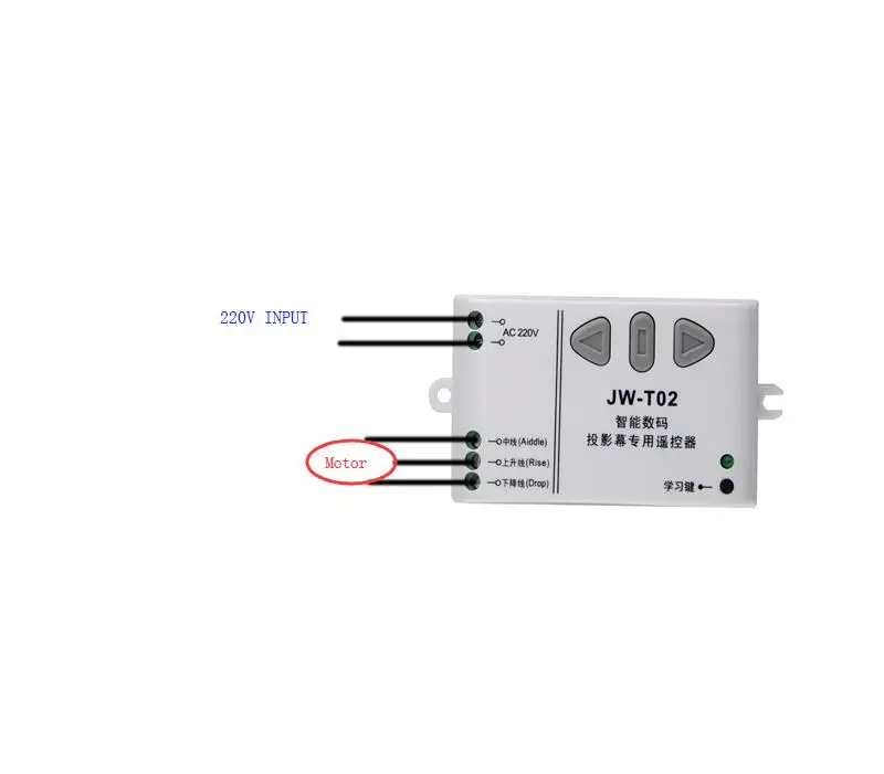 Код обученияВход ac220в для приемника, нажмите кнопку обучения приемника, светодиодный индикатор мигает, затем нажмите кнопку передатчика, светодиодный индикатор выключен, это означает, что обучение успешно. При нажатии кнопки вверх Stop Down вы услышите звук реле.Этот контроллер идеально подходит для трубчатого двигателя, клеммы контроллера для трубчатого двигателя 4 линий (трубчатый мотор желто-зеленая линия подключения к GND).Этот контроллер без ограниченного выключателя, трубчатый двигатель сам с ограниченным переключателем