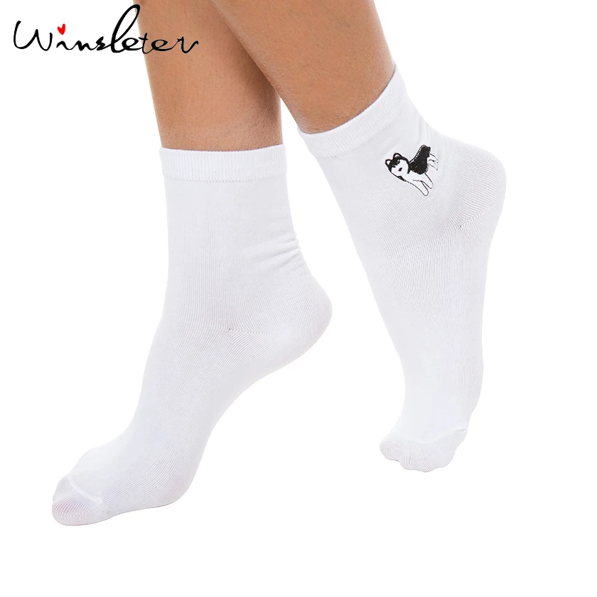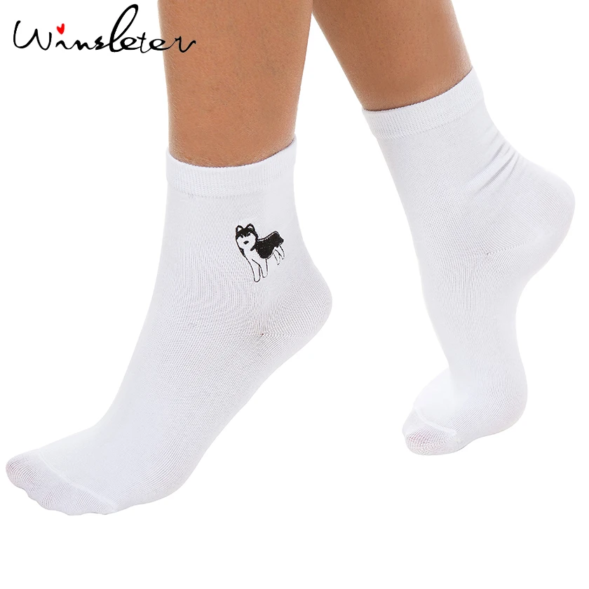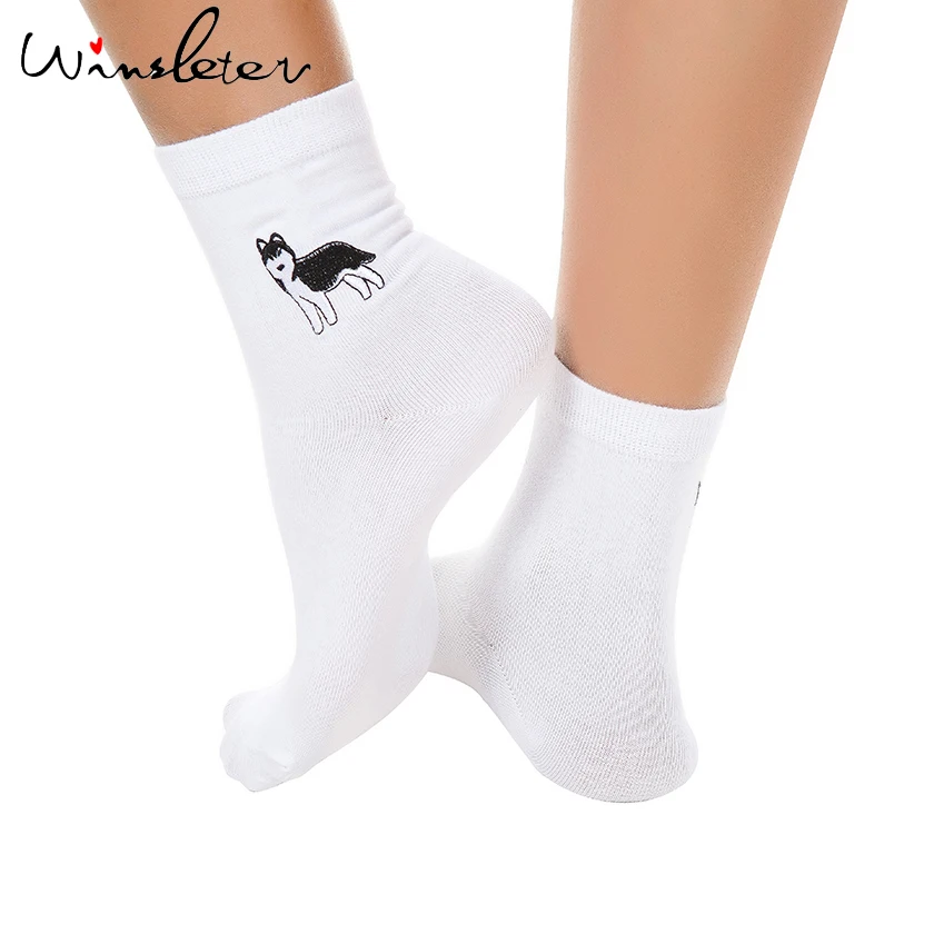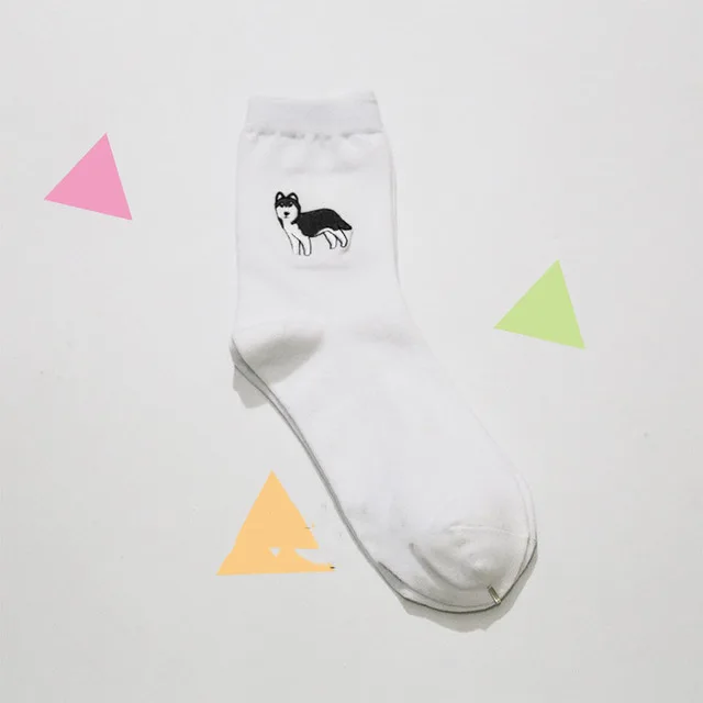 Женские носки, носки с милыми животными хлопок, с вышивкой хаски, забавные, A73201, однотонные шелковые носки