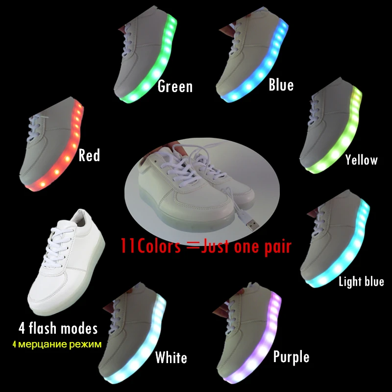 1. Товар поставляется без коробки и зарядного устройства. 2. Для подзарядки используется зарядное устройство мобильный телефон или USB-интерфейс компьютера. 3. Купите пару обуви и получите 11 режимов (7 статичных цветов, 4 режима смены). Когда вы получите эту обувь, пожалуйста, немедленно зарядите ее, Поскольку батарея может разрядиться, Светодиодный ная лампа может быть неяркой. Во время зарядки светильник рается светодиодный индикатор (или мигает).