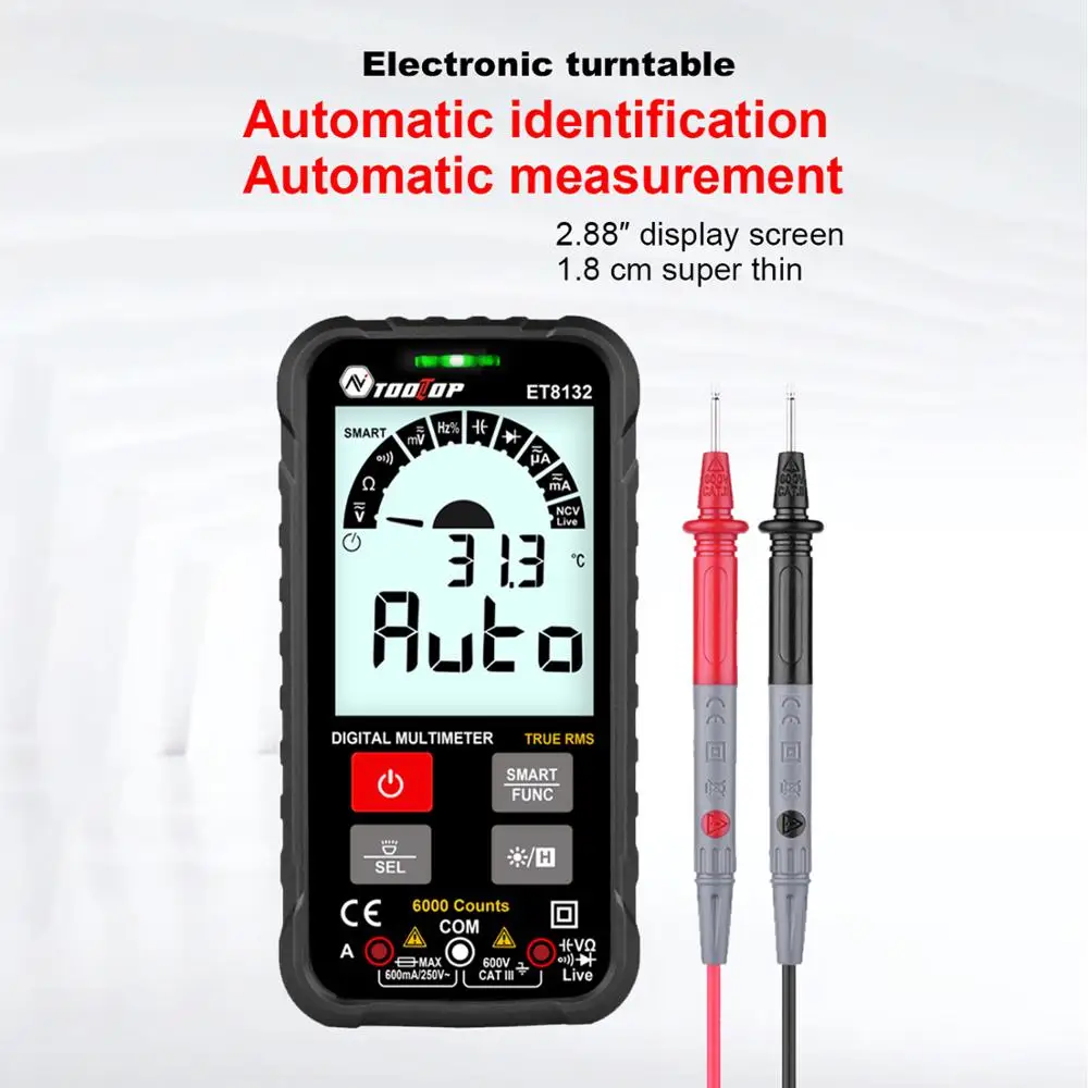 Особенности:2,88 дюймовый ЖК-экран, толщина 18 мм.Автоматическая идентификация, автоматическое измерение.Высокая точность, защита шестерни и интеллектуальный тест.Функции: Интеллектуальное распознавание, Подсказка об отключении предохранительной трубки, проверка истинного среднеквадратичного значения, проверка напряжения переменного/постоянного тока, проверка переменного/постоянного тока, проверка сопротивления, проверка выключения сигнала, проверка частоты, проверка емкости, тест диодов, NCV (Бесконтактное напряжение), под напряжением (идентификация пожарной линии), провод (подсказка об ошибке Джека), ключевая операция, Хранение данных, подсветка.Фонарик позволяет тестировать его эффективно и комфортно в любом месте, в помещении и на улице, днем и ночью.Мягкая защитная крышка, противоскользящая и удобная в обращении.Характеристики:Основной Материал: АБС-пластикЦвет: черныйБатарея: 2 батарейки типа CR2302 (не входят в комплект)Напряжение постоянного тока:Диапазон: 600 мВ/6,000 в/60,00 в/600,0 вТочность: ±(0.5% + 3)Напряжение AV:Диапазон: 600 мВ/6,000 в/60,00 в/600,0 вТочность: ±(0.8% + 3)Постоянный ток:Диапазон: 600.uA/ 6000uA/60.00ma/600.0mAТочность: ±(0.8% + 3)Переменный ток:Диапазон: 600.uA/ 6000uA/60.00ma/600.0mAТочность: ±(1.0% + 3)Сопротивление:Диапазон: 600.0Ω/6.000k Ω/60.00k Ω/600.0k Ω/6.000M Ω/60.00MΩТочность: ±(0.8% + 3)Емкость:Диапазон:9.999nF/99, 99nF/999.9nF/9,999 uF/99,99 мкФ/999,9 uF9999 МФТочность:±(4.0% + 3)±(5.0% + 5)Частота:Диапазон: 99,99 Гц/999,9 Гц/9,999 кГц/99,99 кГц/999,9 кГц/9,999 МГцТочность: ±(1.0% + 3)Обязанность:Диапазон: 0.1% ~ 99.9%Точность: ±(1.0% + 2)Количество: 6000 отсчетовГистограмма: ДаИнтеллектуальная функция (напряжение переменного/постоянного тока, сопротивление и непрерывность): ДаАвтоматическая идентификация входного тока: ДаЖивой тест: Да (звуковая и светильник вая сигнализация)NCV: Да (звуковая и светильник вая сигнализация)Тест диода: Да (звуковая сигнализация)Проверка целостности: Да (звуковая и светильник вая сигнализация)Хранение данных: ДаTrue RMS: ДаФункция подсказки сгорания предохранителя: ДаИндикация низкого заряда батареи: ДаАвтоматическое отключение: ДаФонарик: ДаПосылка: 150*70*30 мм/5,9*2,8 * 1.2inВес посылка: 265 г/9,3 унцииУпаковочный лист:1 * Цифровой мультиметр2 * испытательный провод
