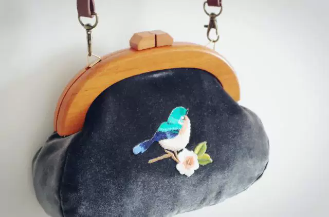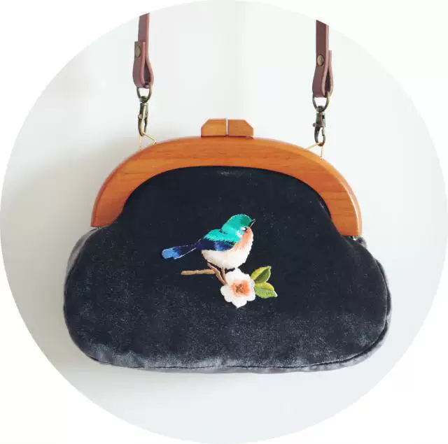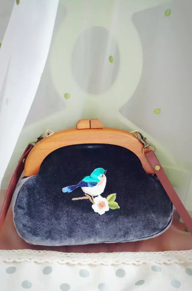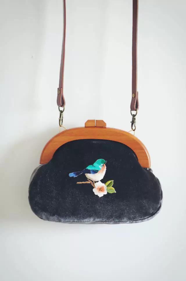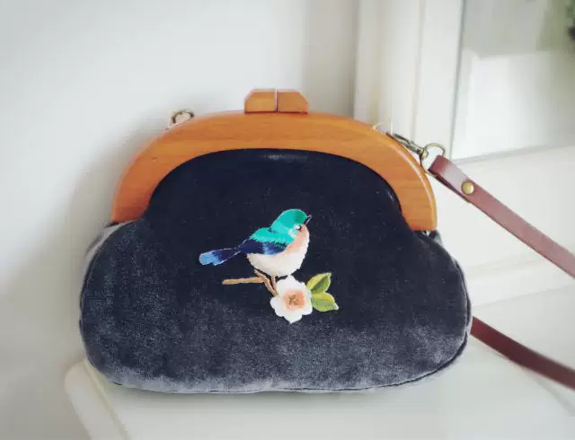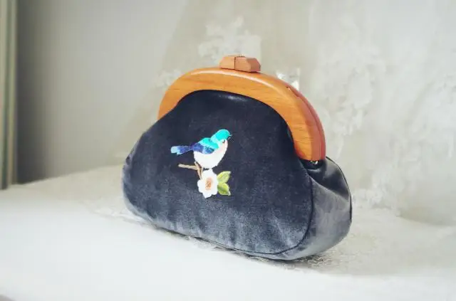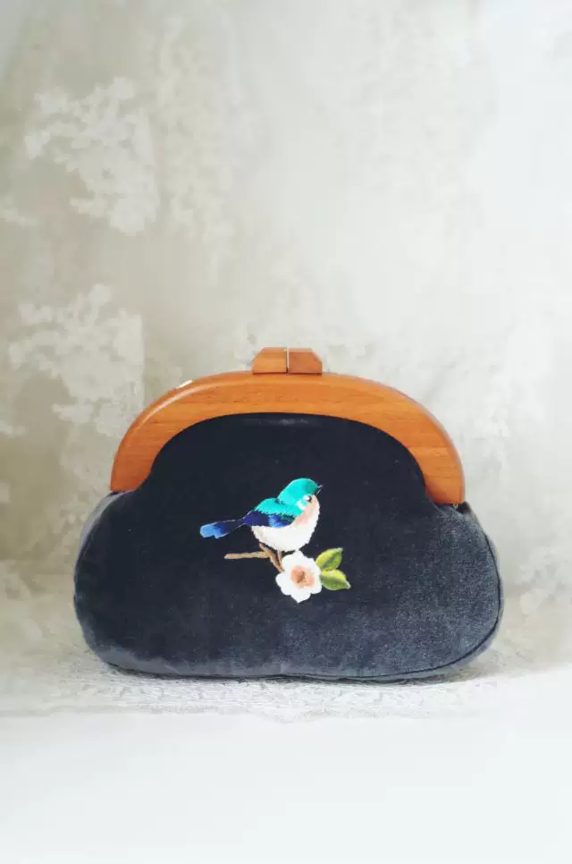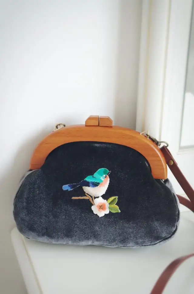 Сумка с вышивкой Angelatracy, винтажная велюровая Сумка-клатч с птицей и цветком, бархатная сумка темно-синего цвета с деревянной ручкой, 2018