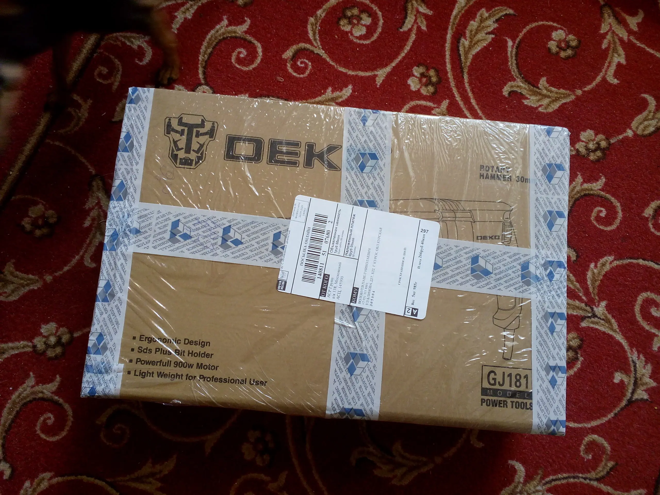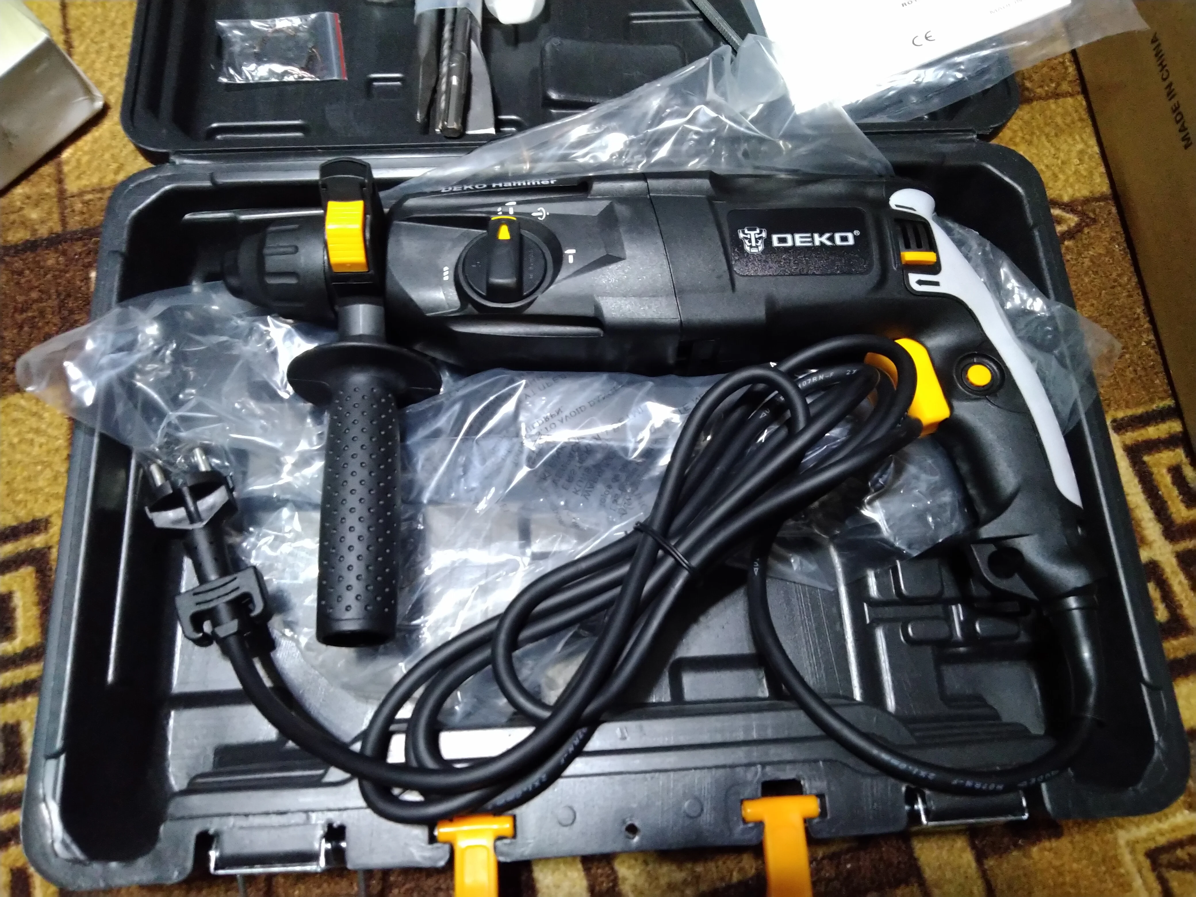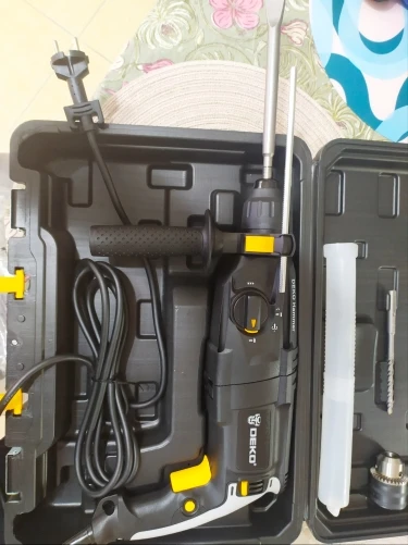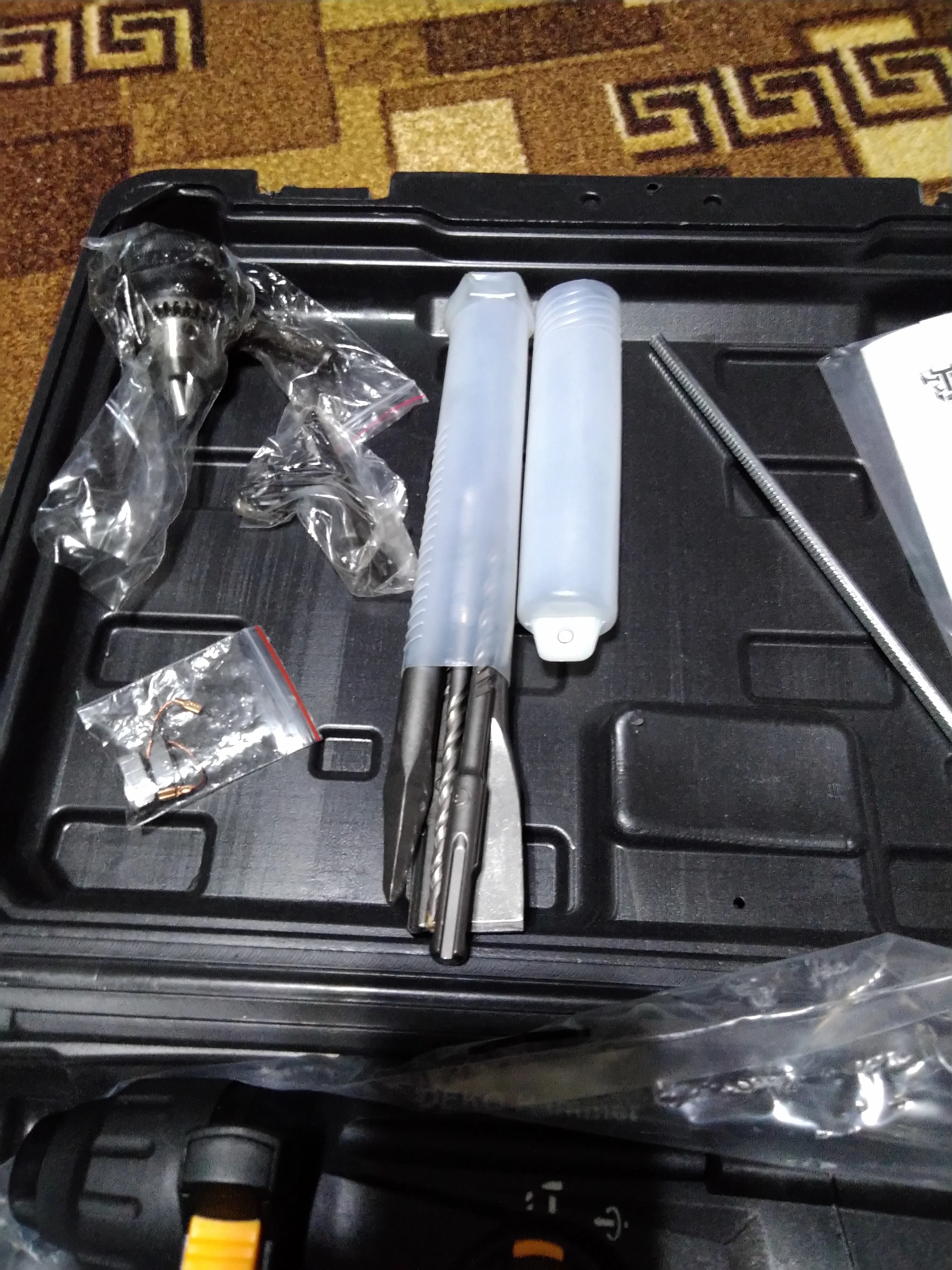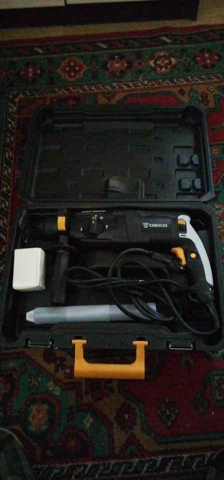 заказали 11.11 получили 16.11. с почты забрали сами, вроде с доставкой брали. картонная коробка была порвана с правой стороны, в самом кейсе была небольшая вмятина снаружи и внутри, где сам перфоратор тоже была трещина. это наверное из-за того, что перфоратор лежал не плотно, не фиксируется в кейсе. внутри обе запасные щетки были полностью сломаны. можно было бы сделать так, чтобы патрон фиксировался, потому что он болтается. пишется, что там 4 функции, но на самом деле только 3, поэтому 4 звезды. включали без нагрузки, работает. после работы под нагрузкой дополним отзыв. с продавцом не общались.