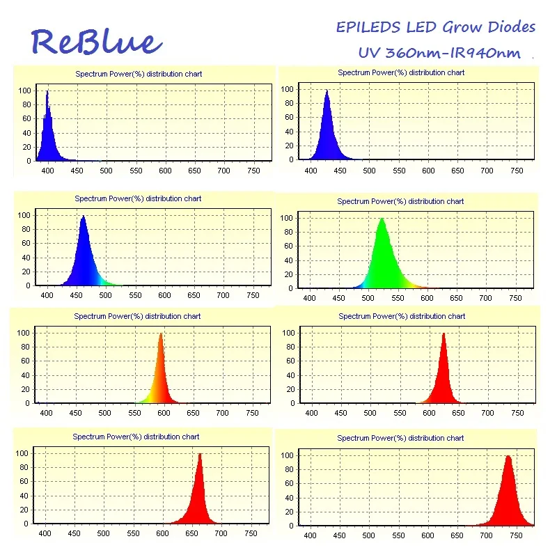 Спектр 450 нм устанавливает регулирование криптохромами и фототропинами, обусловливая различные реакции растений, такие как фототропная кривизна, подавление роста удлинения, движение хлоропласта, регулирование открытия стоматы и роста рассады. Может напрямую поглощаться хлорофиллом в фотосинтезе. Рекомендуется в качестве дополнительного света для саженцев и молодых растений на Вегетативной стадии их цикла роста, особенно когда необходимо уменьшить или устранить «растяжение».