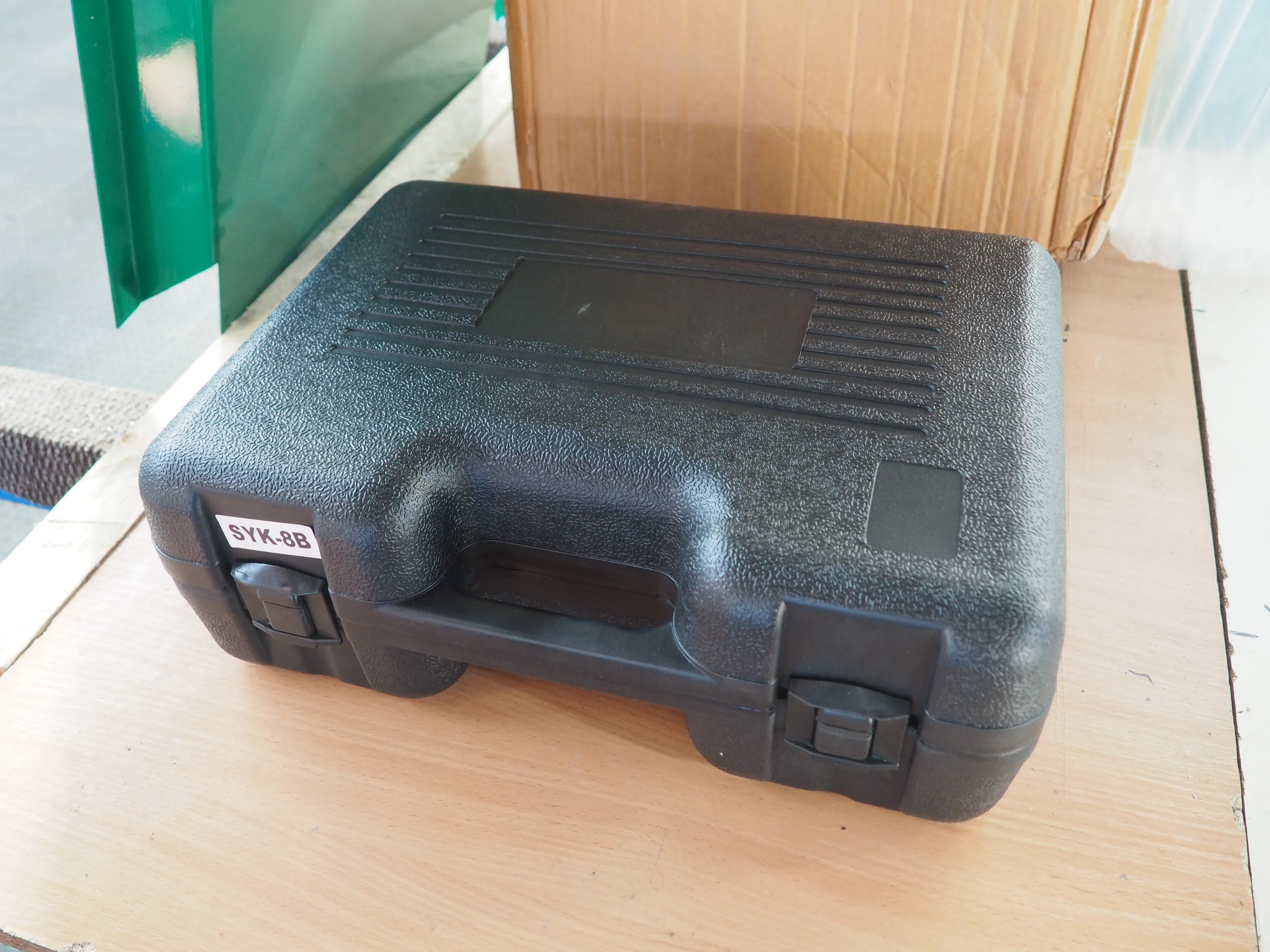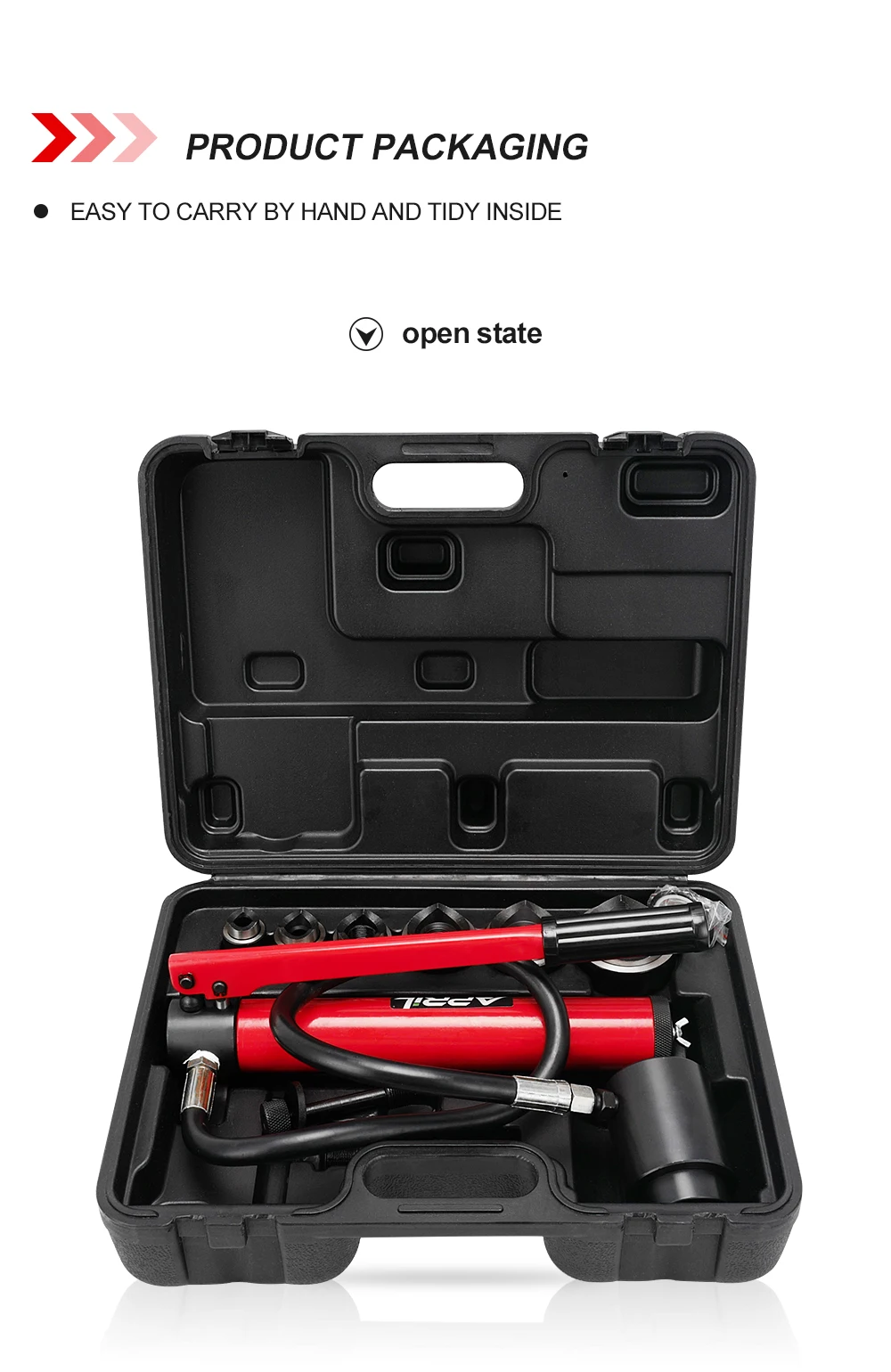 Упаковано все в отдельный чемодан, хорошо бьет отверстия как в стальном листе, так и в алюминиевом