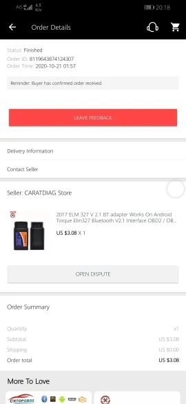 Хорошо получил, не имеет маркировки «elm 327», как на фото, но это нормально, так как это копия. Однако, он работает очень хорошо и позволяет общаться с приложениями car life obd2 для просмотра информации/ошибок и стирания кодов ошибок