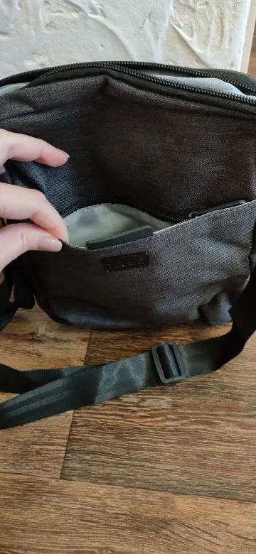 Есть несколько отдельных карманов на замке, плюс внутри разделитель для документов. В целом очень удобная сумка. Материал хороший, нет запахов, крепкий. Сумка понравилась.
