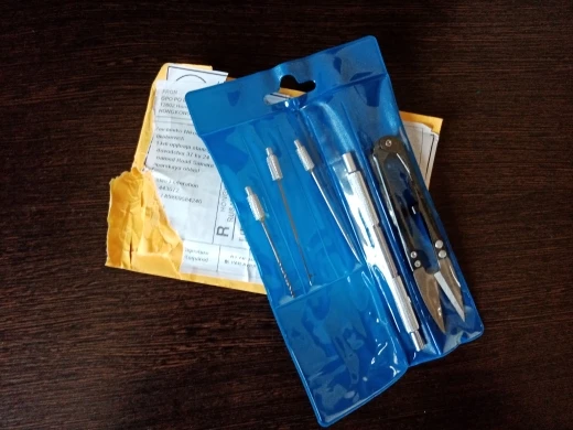 Получил в общей посылке с другими товарами через 3недели.Товар хороший, но:1.достать из чехла,чтобы не порвать его не вышло:уж очень плотно прилипают к нему детали.Надо искать другой чехол 2.я думал что иглы можно внутрь ручки закрутить.Нет,так не выходит,а было бы удобно емко.Ну а функционально все работает.Так как в одной посылке было 6 товаров все отслеживалось по"Почте России".