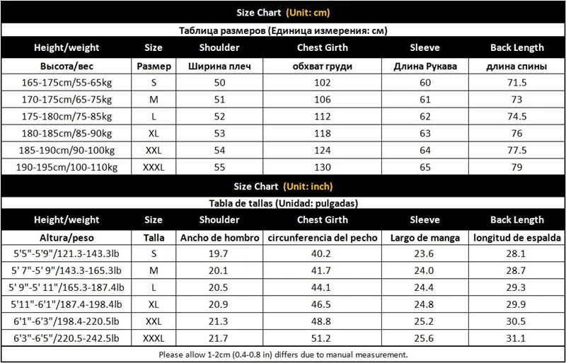 Пожалуйста, выберите свой размер в соответствии с вашим ростом и весом и подтвердите это снова, сославшись на вышеуказанные измерения.