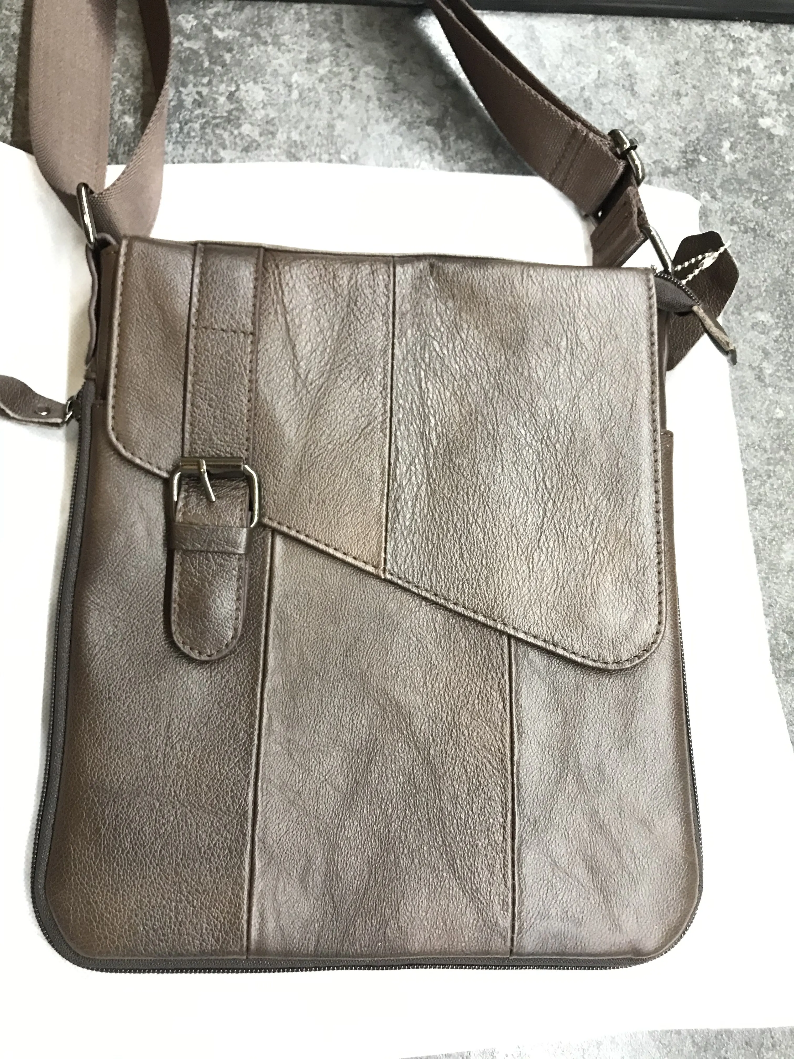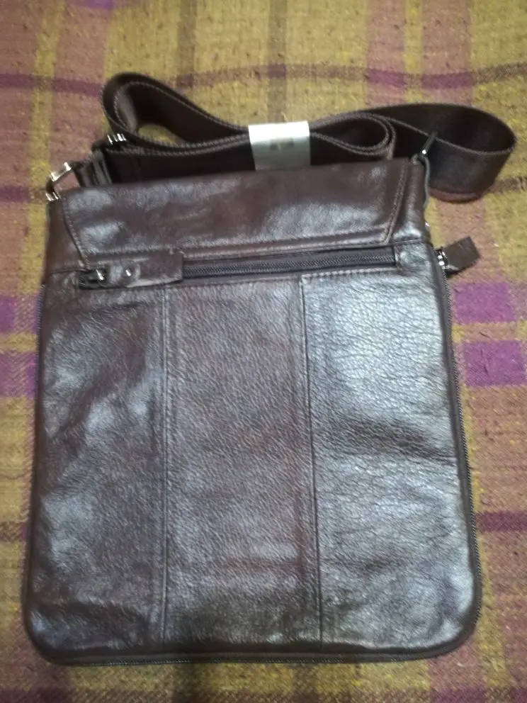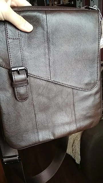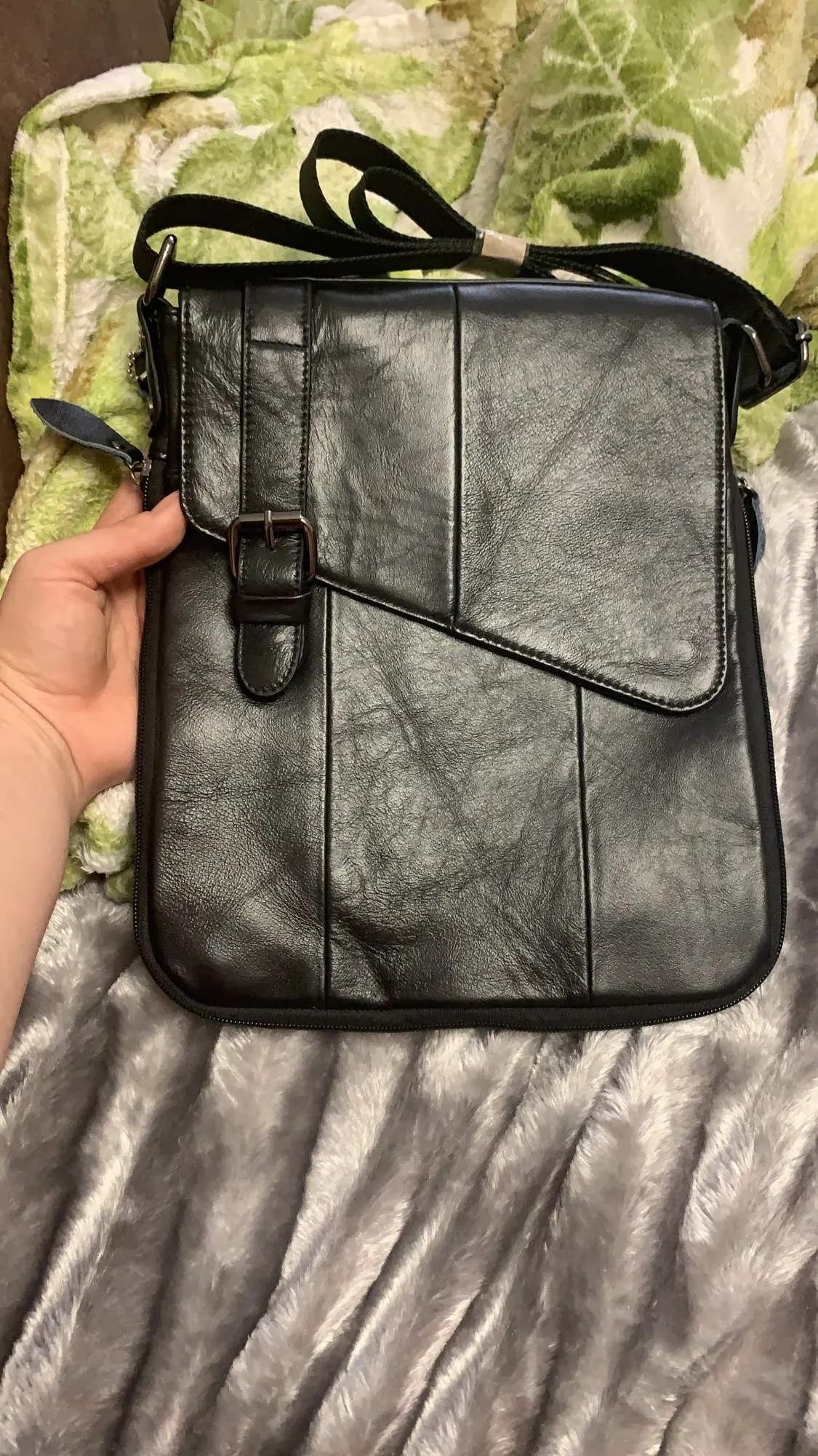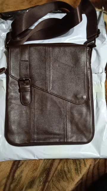 Доставка около двух недель. На мой взгляд сумка выглядит дёшево: кожа тонкая на ощупь, кажется что сейчас порвётся; фурнитура неплохая, но молния не зафиксирована и открывать-закрывать будет неудобно; строчки ровные, есть небольшой запах. Мужу сумка не понравилась. Пожалела, что не купила в магазине города нормальную кожаную сумку. Это конечно же не натуральная кожа, поэтому снимаю одну звезду!