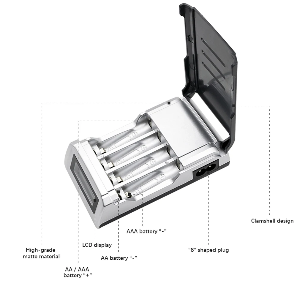1. Это зарядное устройство может заряжать 1-4 шт. AA/AAA Ni-MH/Ni-Cd аккумуляторные батареи ЖК-дисплей.2. Зарядка под управлением IC. V умно отключает режим быстрой зарядки, затем переводит на Трикл зарядку, обеспечивает полную зарядку, тем временем защищает от перезарядки.3. Есть буква "CHG", показывающая на ЖК-дисплее после загрузки батареи.