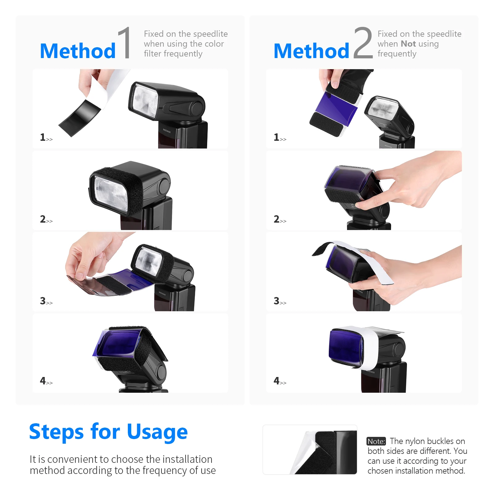 Крепится на липучке и резиновой ленте, прост в использовании, в комплекте держатель фильтра подходит для большинства вспышек крепления обуви.
