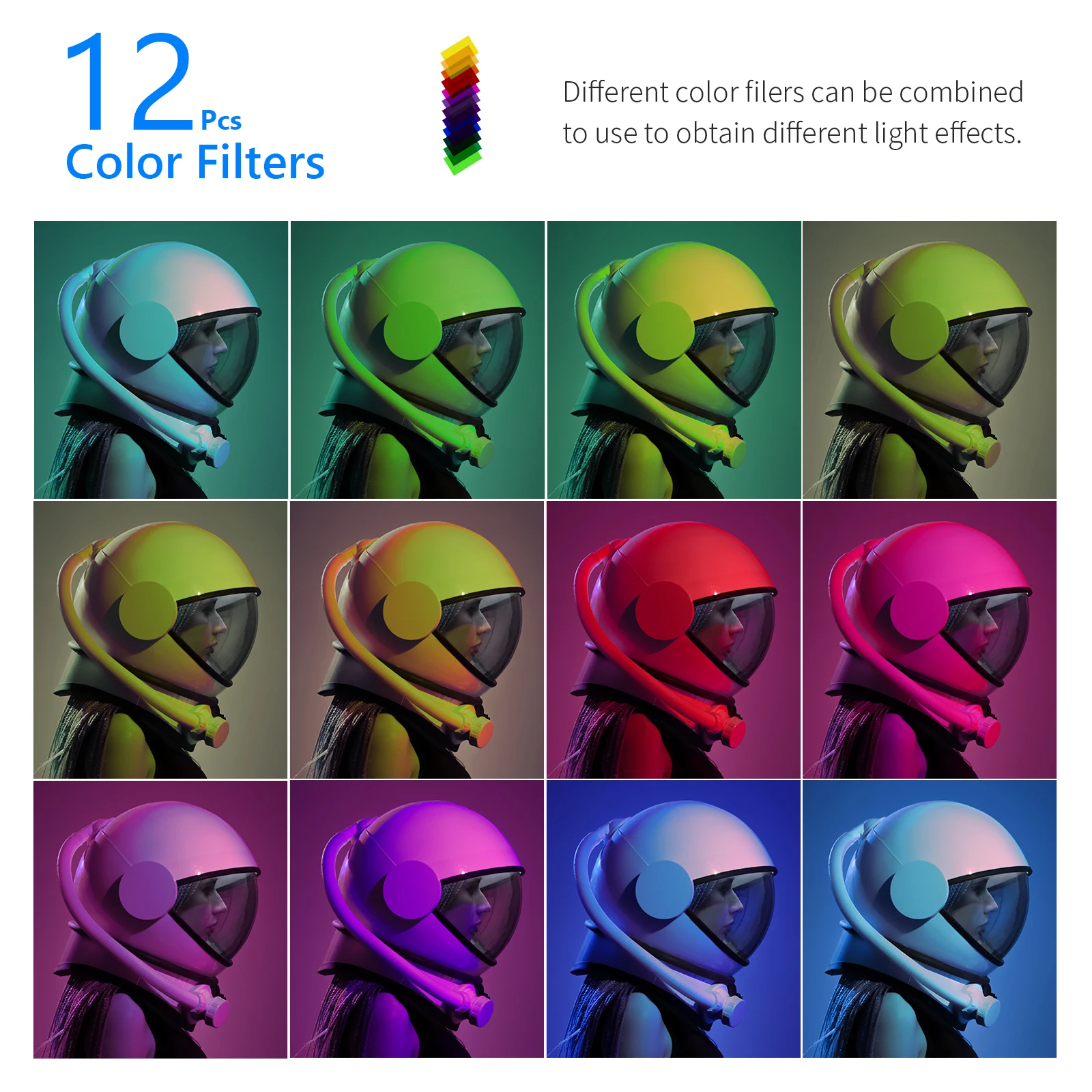Обеспечивает 12 различных цветовых температур, создавая эффект различных цветов на светильник. 12 цветных фильтров изготовлены из высокопрозрачного материала, цветовая температура стабильна, потери небольшие, легкие и прочные, широкий спектр применения.