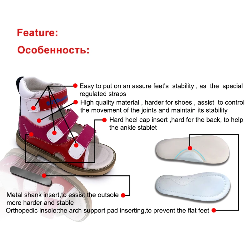 > 1. Каковы ортопедические туфли?Ортопедическая обувь-это медицинская обувь, призванная предотвратить и исправить патологию ног, может защитить стопу сустава и исправить деформацию ног, чтобы помочь здоровому росту суставов детской ноги.> 2. Каковы особенности ортопедической обуви?1) прочные и прочные удлиненные задние колпачки стабилизируют стопу в правильном положении.2) мягкие внутренние воротники обеспечивают гладкий контакт кожи с краями обуви во время движения.3) Арка поддержки стельки и Томас пятки подошвы, чтобы дать поддержку стопы.4) застежка на липучке плотно фиксирует ноги внутри обуви> 3. Каковы функции ортопедической обуви?Для профилактики и лечения ортопедических аномалий. Для предотвращения и исправления детской плоскостопия, лапки, стопа с вальгусной деформацией, супинатором, пронатором, клубной стопой, ногой X/O и т. д.> 4.подходит ли для ортопедической обуви нормальная стопа?Да, нормальные здоровые ноги также подходят для ношения ортопедической обуви. Ортопедическая обувь очень важна для первых шагов ребенка, фиксирует стопу, увеличивает площадь опоры стопы и перераспределяет нагрузку на тело, избегая деформации стопы, чтобы помочь нормальному здоровому росту ног. Поэтому родитель должен начать выбирать ортопедическую обувь для ваших детей, когда ребенок учится ходить.