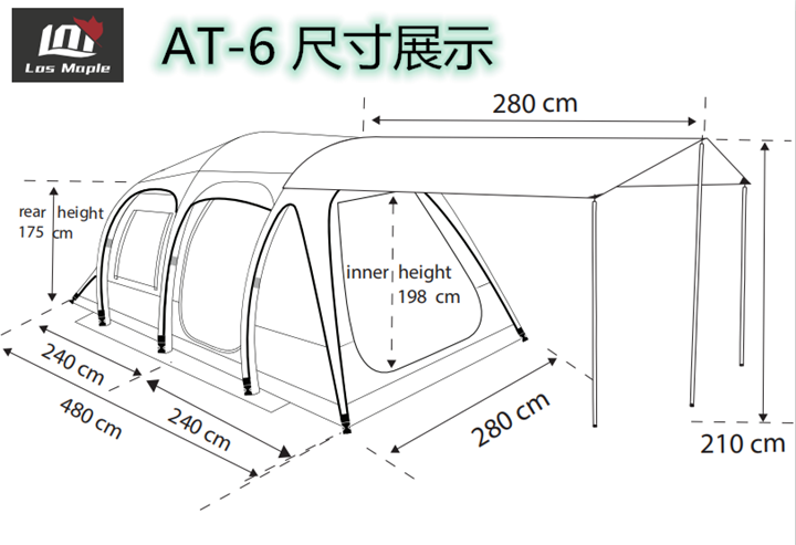 AT-6 размер палатки: 480 см Д × 280 см Ш × 215 см в (длина х ширина х высота)