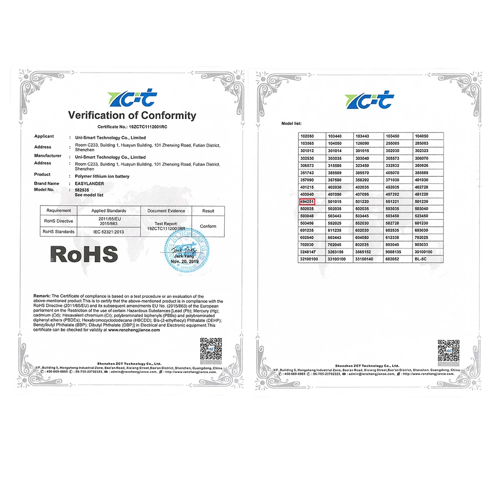 CE + Rohs литий-ионный Литий-полимерный аккумулятор 800 мАч 3,7 в 6...