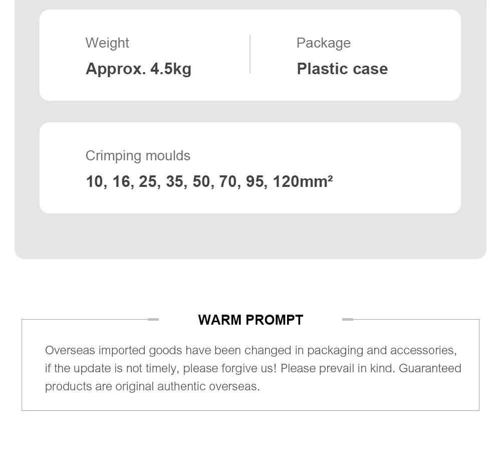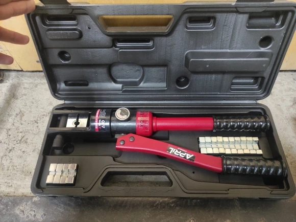 Инструмент пришел в Магадан целым, фирменная коробка не помята. Внешне качество инструмента вполне приличное, но в упаковочном пакете внутри кейса вытекло приличное количество масла с гидравлического цилиндра, в кейсе и на самом инструменте (не закручен до конца гидроцилиндр). Исправил протечку и обжимал пока что от 10 - 25мм2, обжимает хорошо. Если бы не утечка масла с гидроцилиндра поставил бы все 5 звезд, а так оценку снизил.