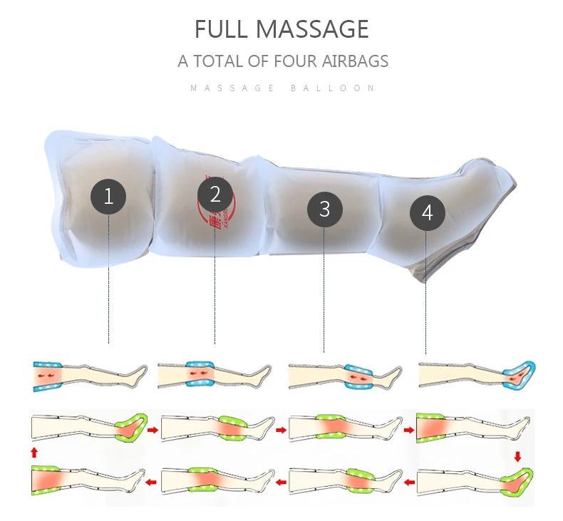 Домашний пневматический массажер, благодаря многократному повторному перезапуску воздушного шара, образованию тела в соответствии с циклом давления, от дистальных конечностей до корпуса парчи, равномерной и упорядоченной экструзии, стимулирует кровоток и лимфатию, улучшает микроциркуляцию, ускоряет рефлюкс в крови конечностей, Помогает предотвратить образование тромбоза, предотвращает отек конечностей, может прямо или косвенно предотвратить кровообращение заболевания, рукав изготовлен из материала ТПУ для дома, гостиницы, салонов красоты, больниц, место и т. Д.1. Состав продукта