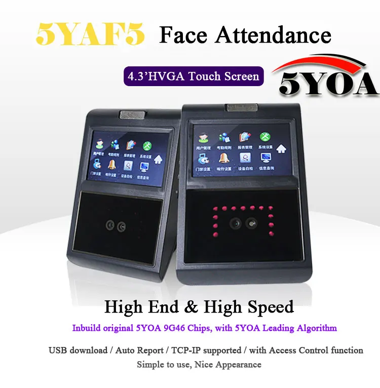 5YAF5-это полностью автономное устройство для посещаемости лица и доступа, оно продается на рынке посещаемости среднего этапа и доступа. Это Поддержка трех видов машин, ALO машины, суб-машины и Ридера. Он может быть использован 300 пользователями, и пользователь может использовать метод ввода T9 на клавиатуре для ввода имени пользователя, когда он преуспеет, на экране будет Изображение пользователя. Со стандартным WG и сигналом переключения.