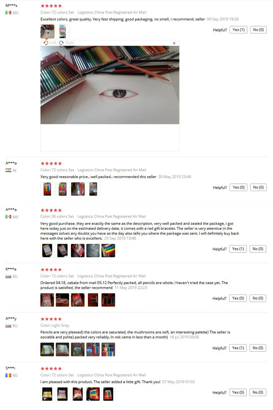 Здравствуйте. очень долго ждала посылку с карандашами, аж с ноября месяца, получила её в феврале, благодаря тому, что открыла спор, подала на возврат. Только тогда продавец начал шевелиться. До открытия спора продавец отвечал:-"ждите". Дошло до того, что сам сайт Али вмешался, уверив в том, что посылка придет, так как продавец попросил отсрочку. Карандаши упакованы в пупырку, ни один не сломался, на вид потрясающих цветов. Пока не использовала.