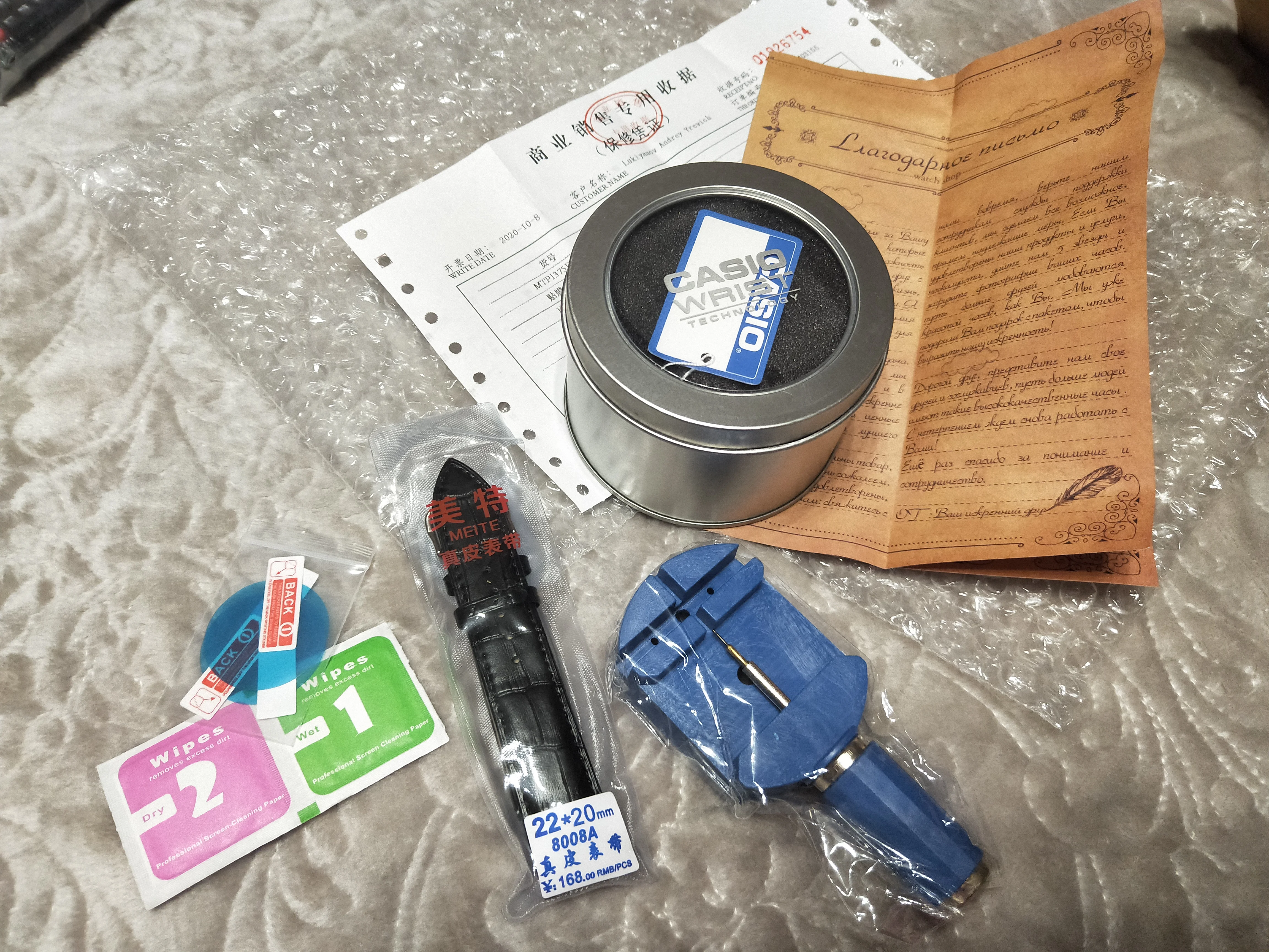 Доставка конечно долгая, но оно того стоит. В комплекте ответка для регулировки ремешка и защитные стекла. Упаковка отличная. Спасибо продавцу.