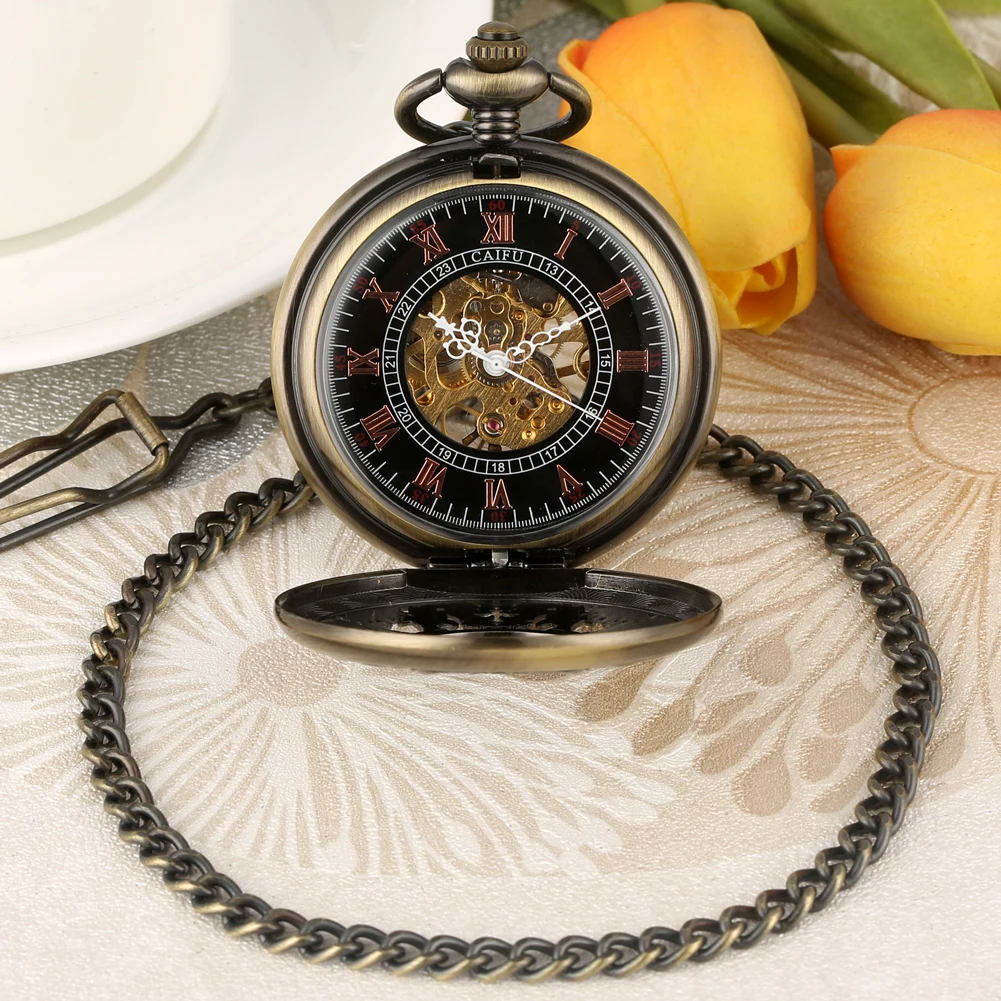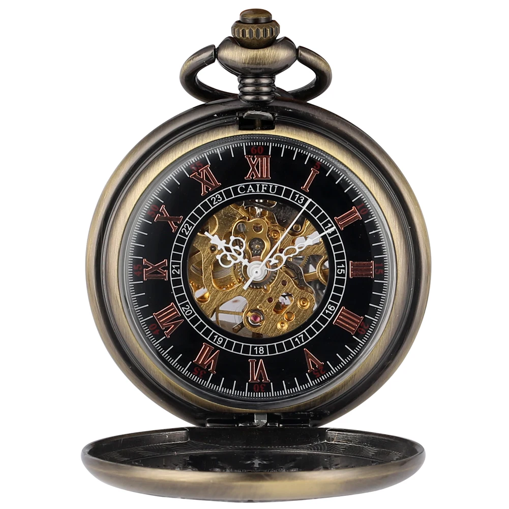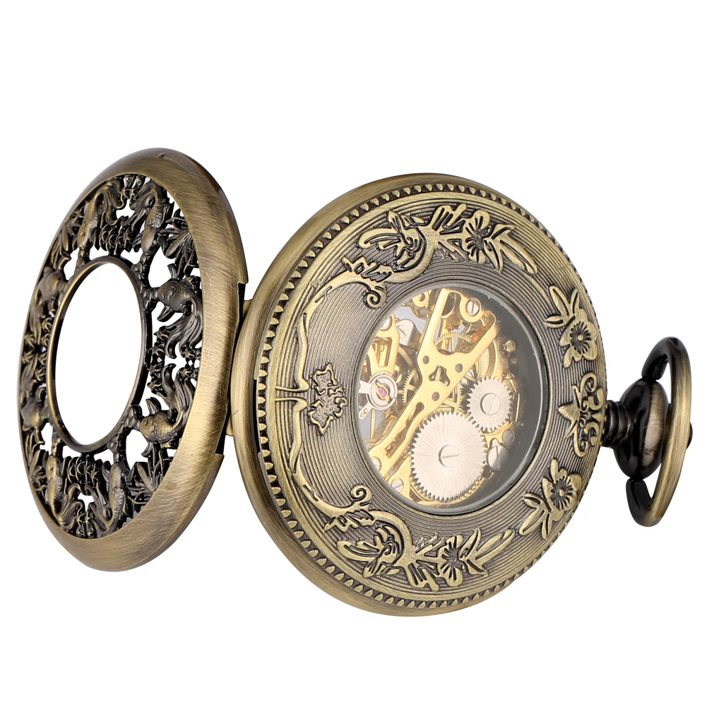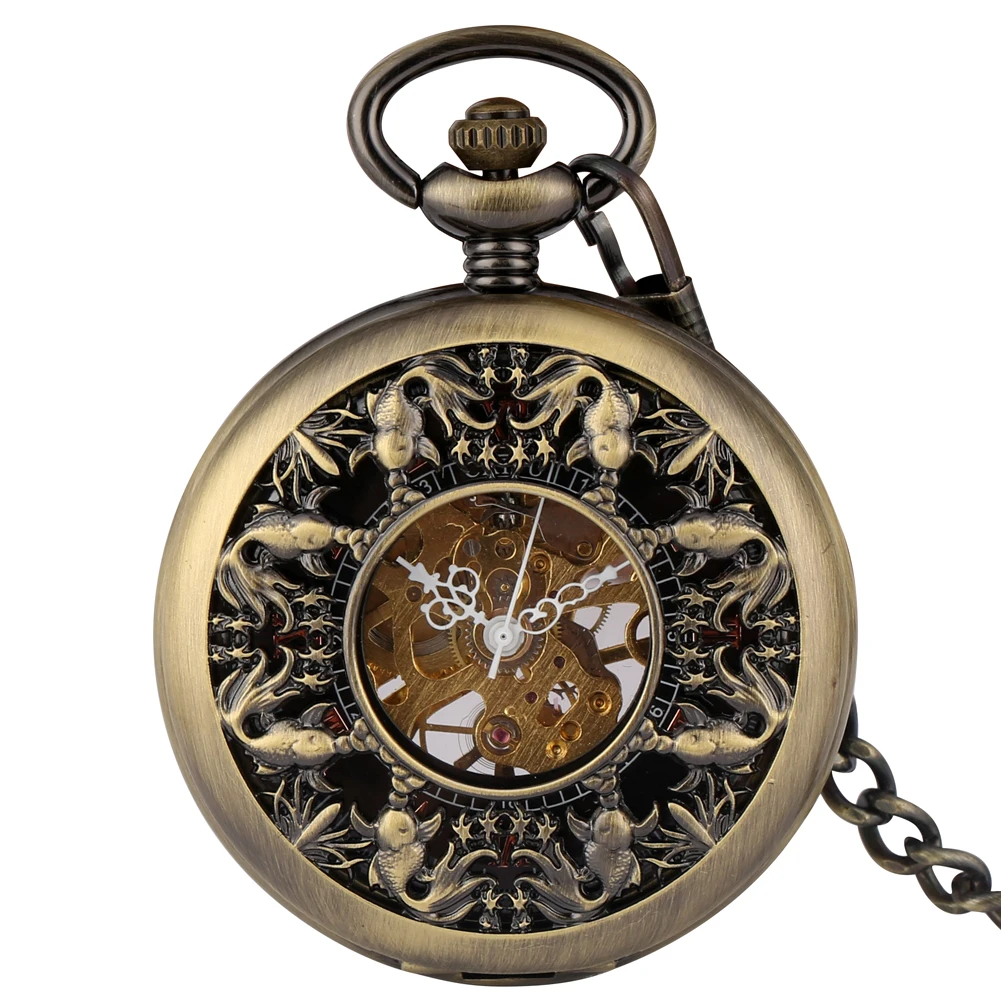 Винтажные Механические карманные часы-скелетоны с ручным заводом, бронзовая подвеска, цепочка-брелок, резьба в виде золотой рыбки, подарки для женщин и мужчин