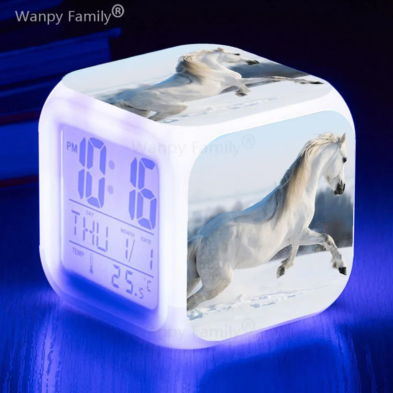 Новинка 2022, часы-будильник с белой лошадью, 7 цветов, светящиеся светодиодные цифровые часы, часы для детской комнаты, будильник, настольные часы, рождественский подарок для детей