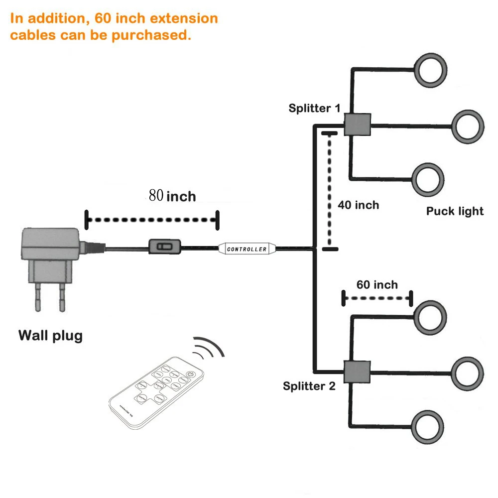 Разделительная муфта можно подключить до 3 ,4 или 6 СИД шайбовые светильники, 1,5 м Длина сетевого шнура каждой лампы, длина: 1 м адаптер DC провода.