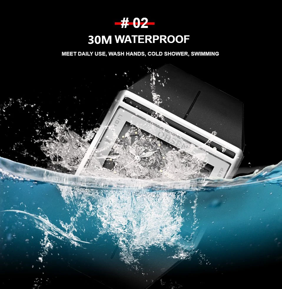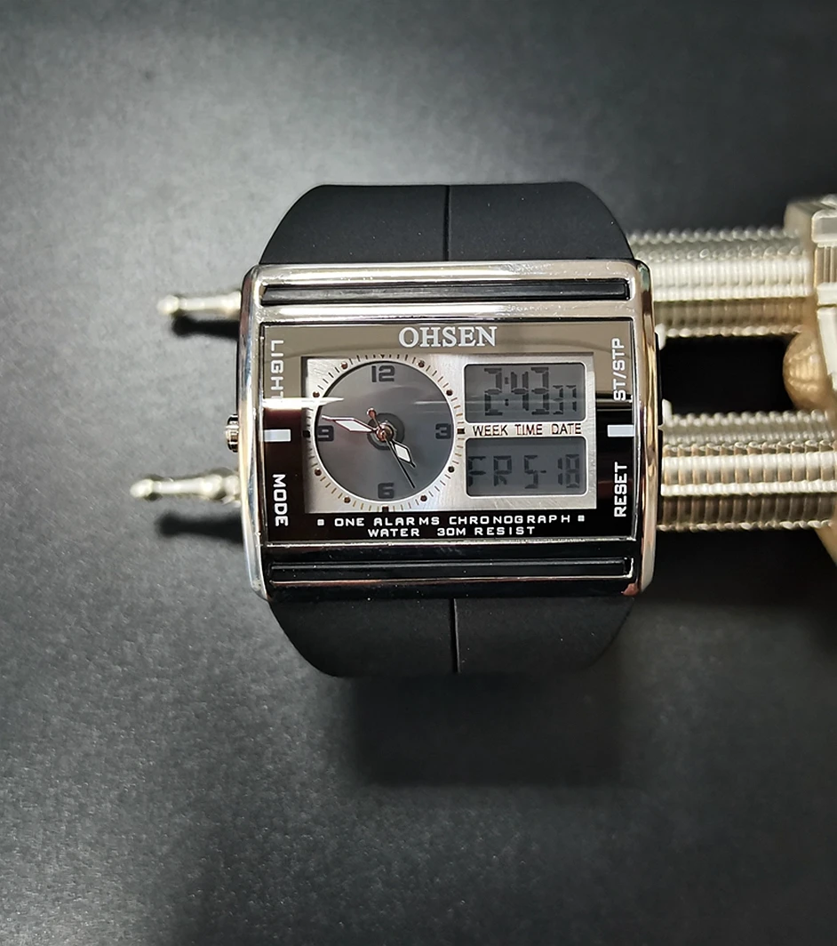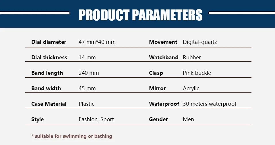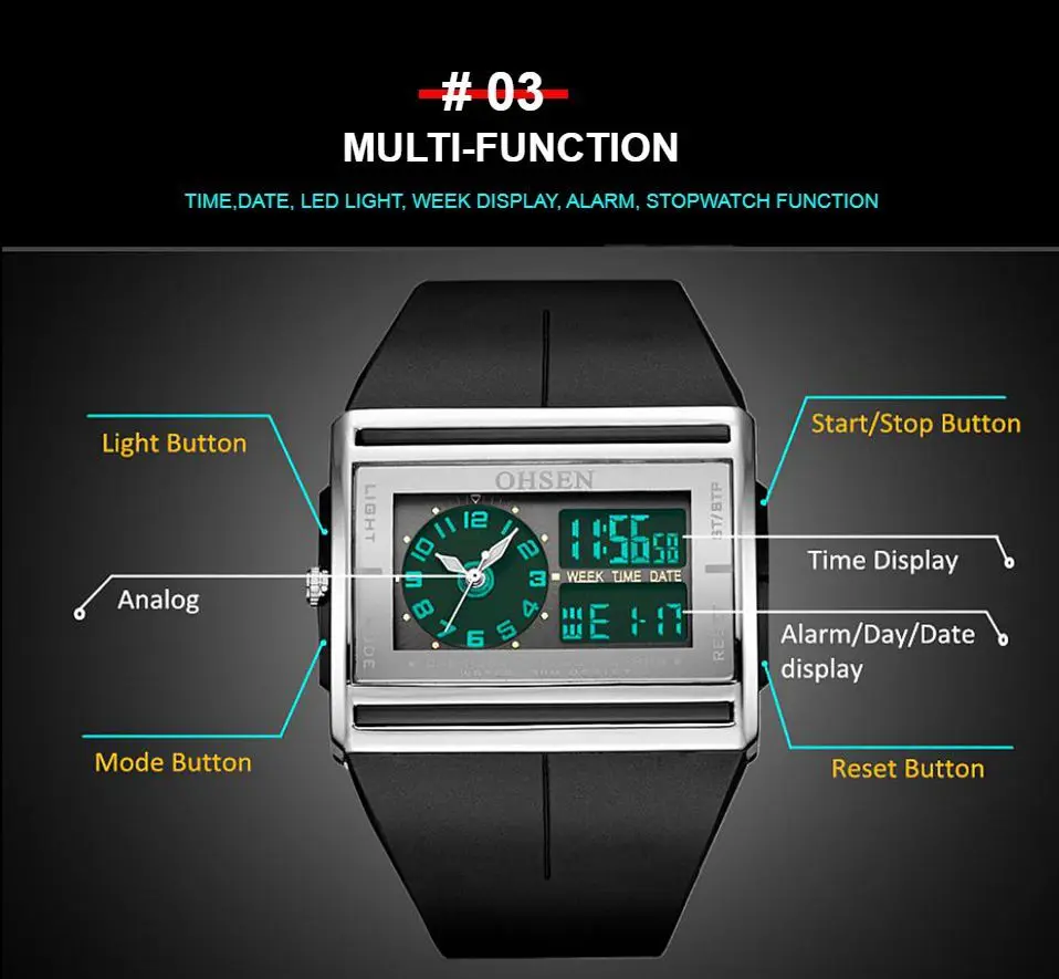 Двойной дисплей времениЦифровой: часы, минуты, секунды, вечера, месяц, дата, деньФормат 12/24 часовЦифровой светодиодный дисплей, нажмите кнопку «светильник», чтобы четко видеть время в темнотеБудильник и функция ежечасного звонкаСпециальная конструкция с хронограф (секундомер) при температуре не выше 0,01 второй шагВодонепроницаемость до 50 м (не нажимайте кнопку в воде)Ударопрочность, подходит как для занятий спортом на открытом воздухе, так и для занятий спортом в помещении