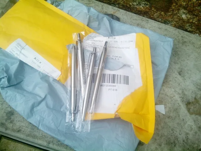 Pedido realizado el 28 de enero, llegó hoy 16 de febrero de 2021. Los bolígrafos son exactamente iguales a las fotografías. Funcionan perfectamente y se deslizan suavemente en el papel. Las cargas tienen las puntas protegidas para evitar que se sequen. Venían protegidos en sobre de burbujas. Llegaron impecables y funcionan perfectamente.