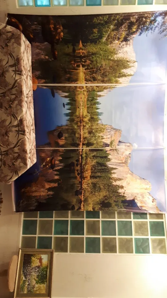 Доставка хорошая, пришло в целости. Рисунок немного размытый, но с расстояния > 1 метра это уже не заметно. Между полотнами рисунок сходится, соединение полотен встык (не в нахлест). Однако по описанию материал - древесно-волокнистый текстиль и ожидалось, что они будут флизелиновые (или что-то подобное) на бумажной основе. По факту холст оказался пластиковым, он вонючий и плавится, а не горит. Пришлось их повесить для начала на скрепках, чтобы запах выветрился.Не представляю, каким клеем их можно приклеить на стену. Подойдет ли ПВА?