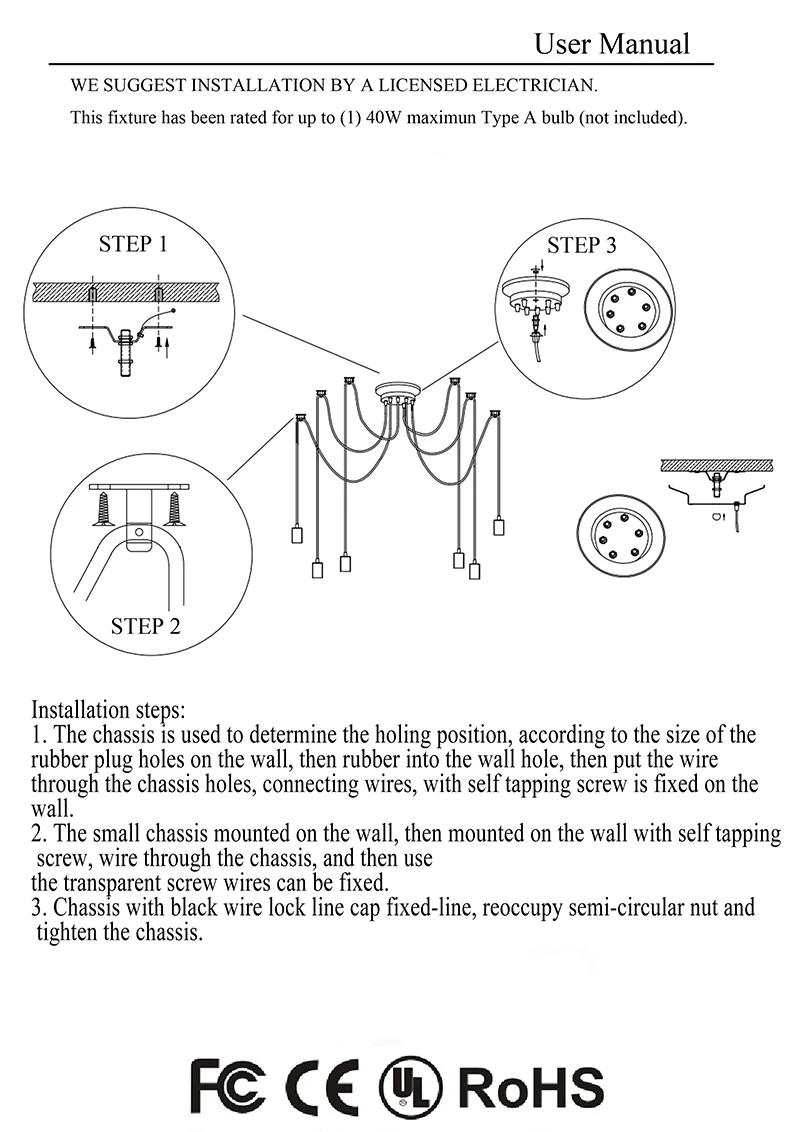 Мы предлагаем установку лицензированным электриком. Данный светильник рассчитан на лампу (E27) максимальной мощности 40 Вт типа А (не входит в комплект). Предупреждения: