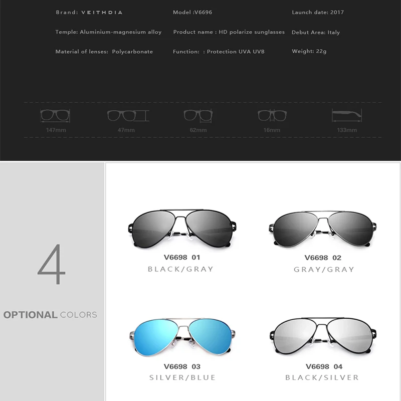 Солнцезащитные очки для мужчин и женщин, Veithdia, "авиаторы", VT6698