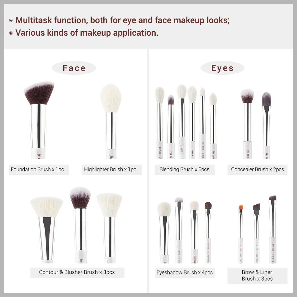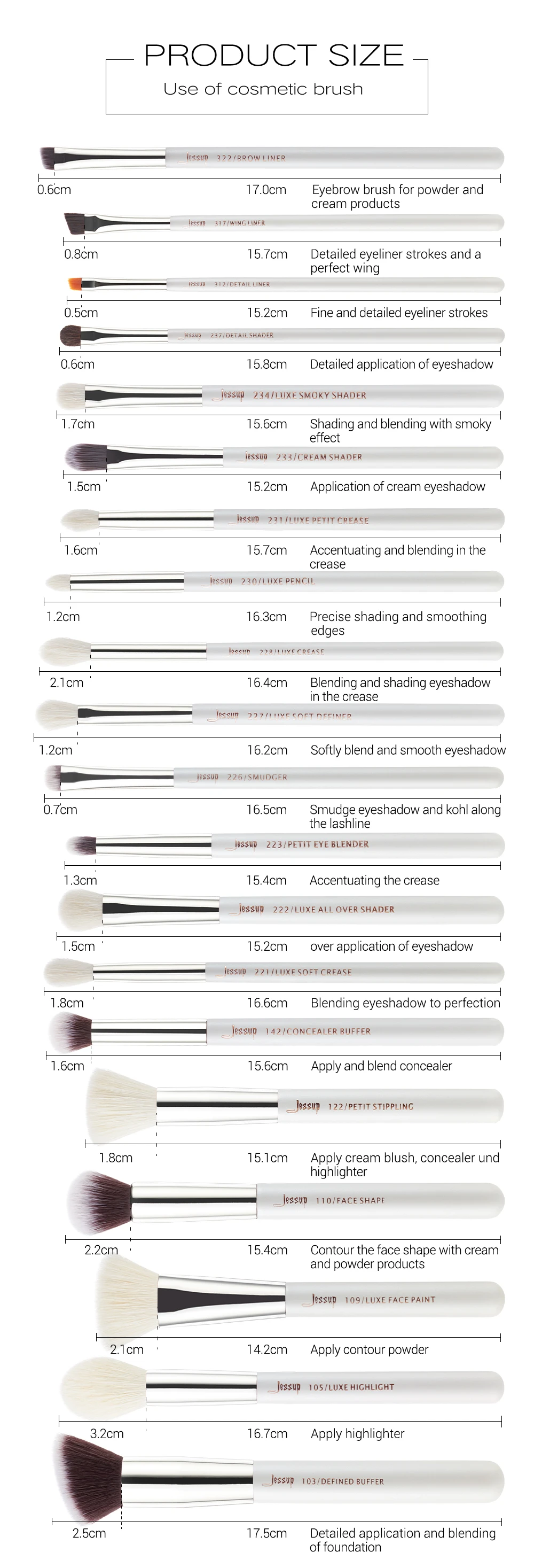 1 кисть для нанесения основы: #103; 3 шт. х Контурные и румяна кисти: #109, #110,#122; 1 кисть для хайлайтера: #105; 2 шт. x консилер: #142 , #233; 6 шт. x смешивание: #221, #223, #227, #228, #230, #231; 4 шт х теней для век: #222, #226, #234, #237; 3 шт. x бровей и подводки: #312 , #317, #322
