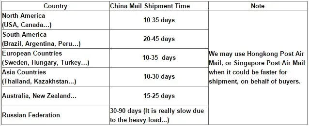 Как правило, товар будет отправлен в течение 5 рабочих дней после оформления платежа. Мы предоставляем бесплатную доставку, используя авиа-отправление Почты Китая (CPAM). Каждая посылка отправляется зарегистрированным почтовым отделением, так как она безопасна.