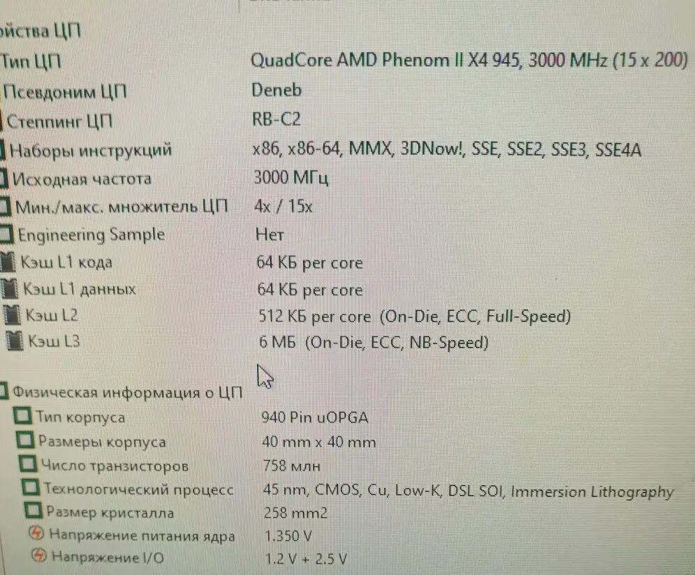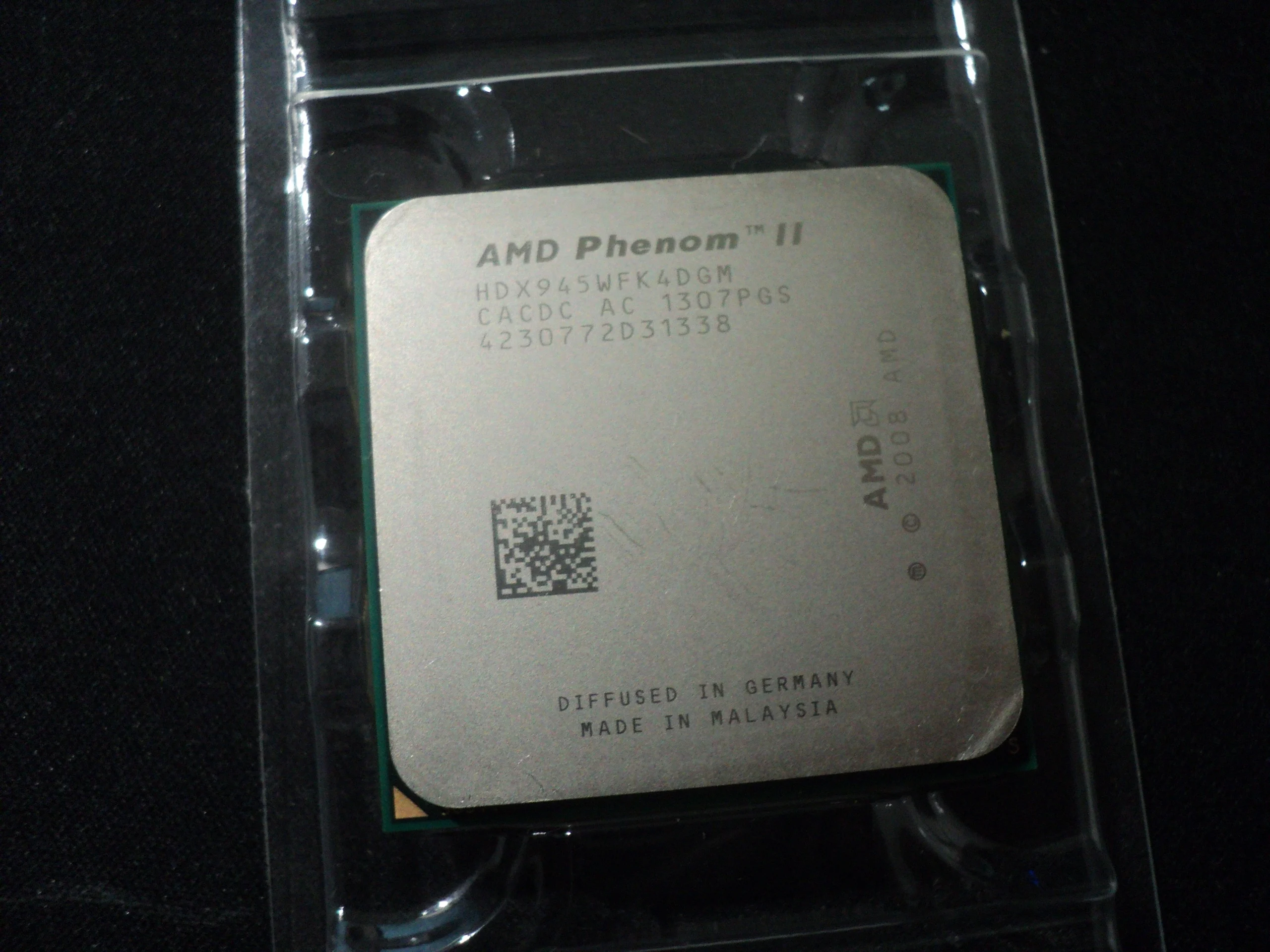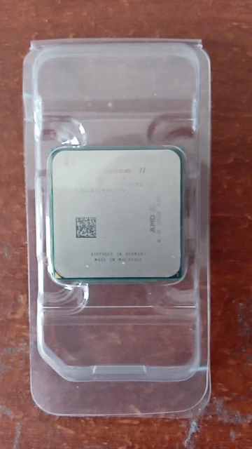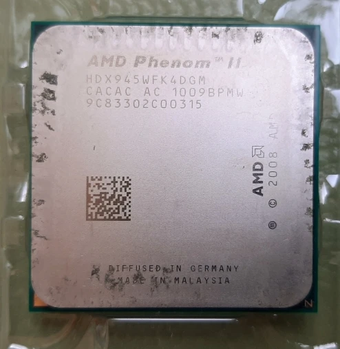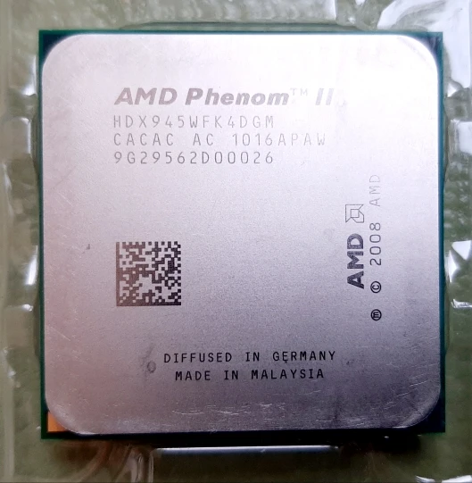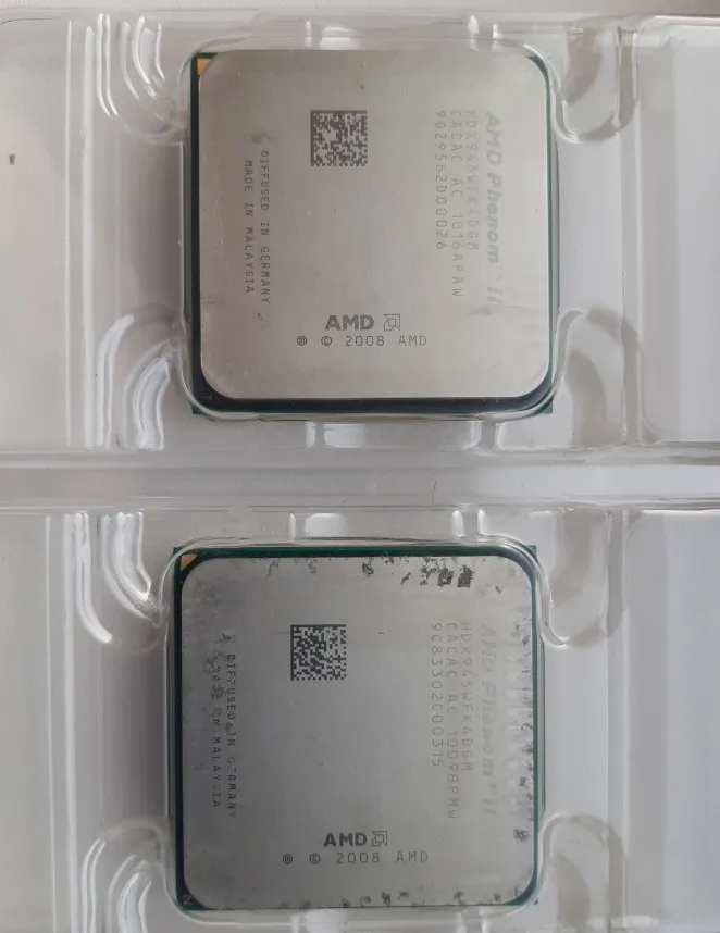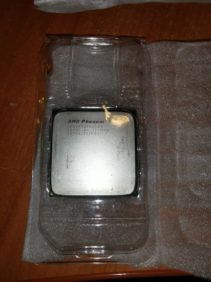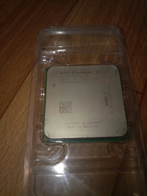 Заказывал два процессора, на работу, как вариант бюджетного апгрейда компов. Взамен процессоров семейства Athlone X2. Отправка мгновенная, доставка в составе сборной посылки тоже очень быстрая - заказал 21 декабря, получил уже 6 января. Это редкость за последний год. Продавцу респект и успехов. Проверить работоспособность смогу только после новогодних праздников. Степпинг процессора С3, маркировка HDX945WFK4DGM. Полноценный четырех-ядерник, с кэшем 3-го уровня. Внешний вид у обоих процессоров сильно разный - один в идеальном состоянии, у другого сильные потёртости на крышке. Ножки у обоих ровные, упаковка стандартная. Термопасты в комплекте нет, оно и не нужно. Надеюсь, что оба процессора рабочие.