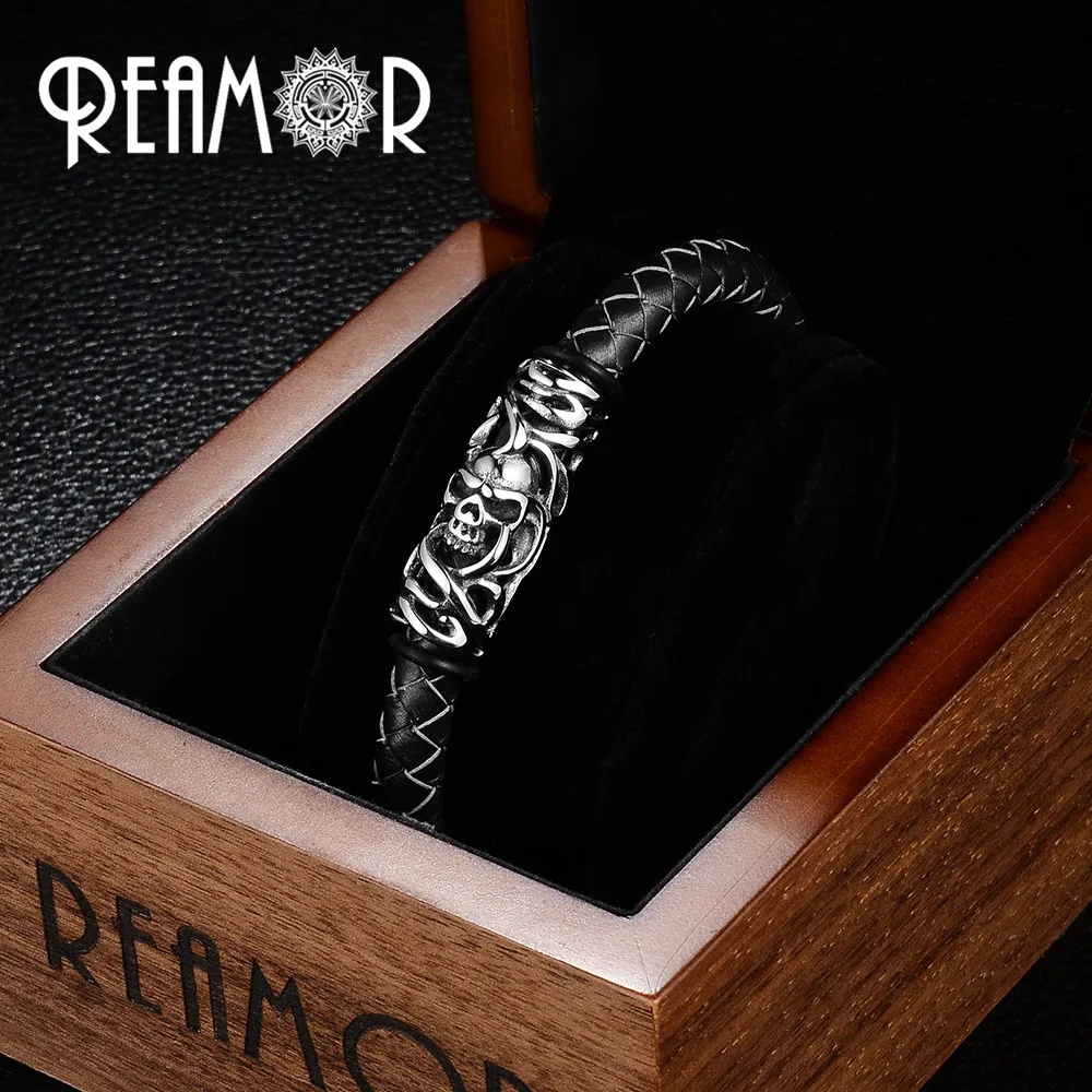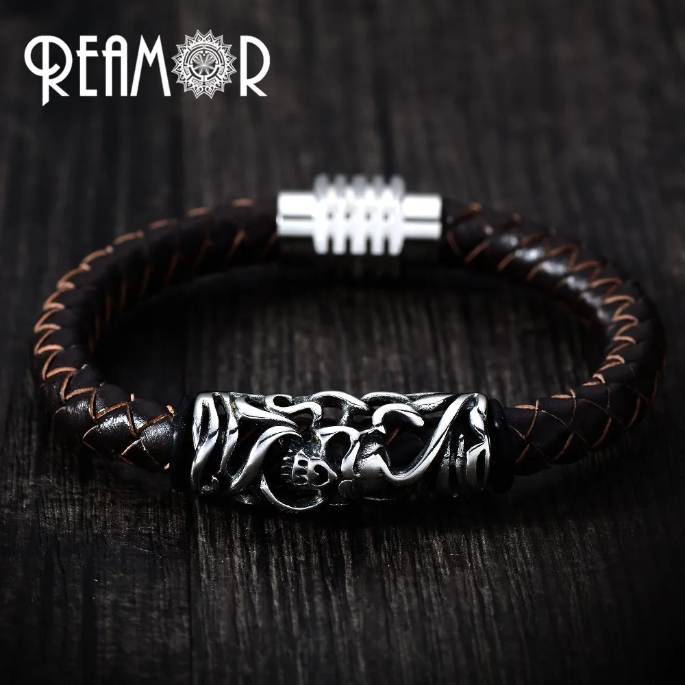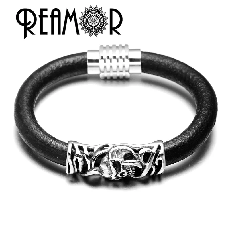 Мужские браслеты REAMOR из натуральной кожи 316l из нержавеющей стали с полыми искусственными украшениями с магнитными застежками
