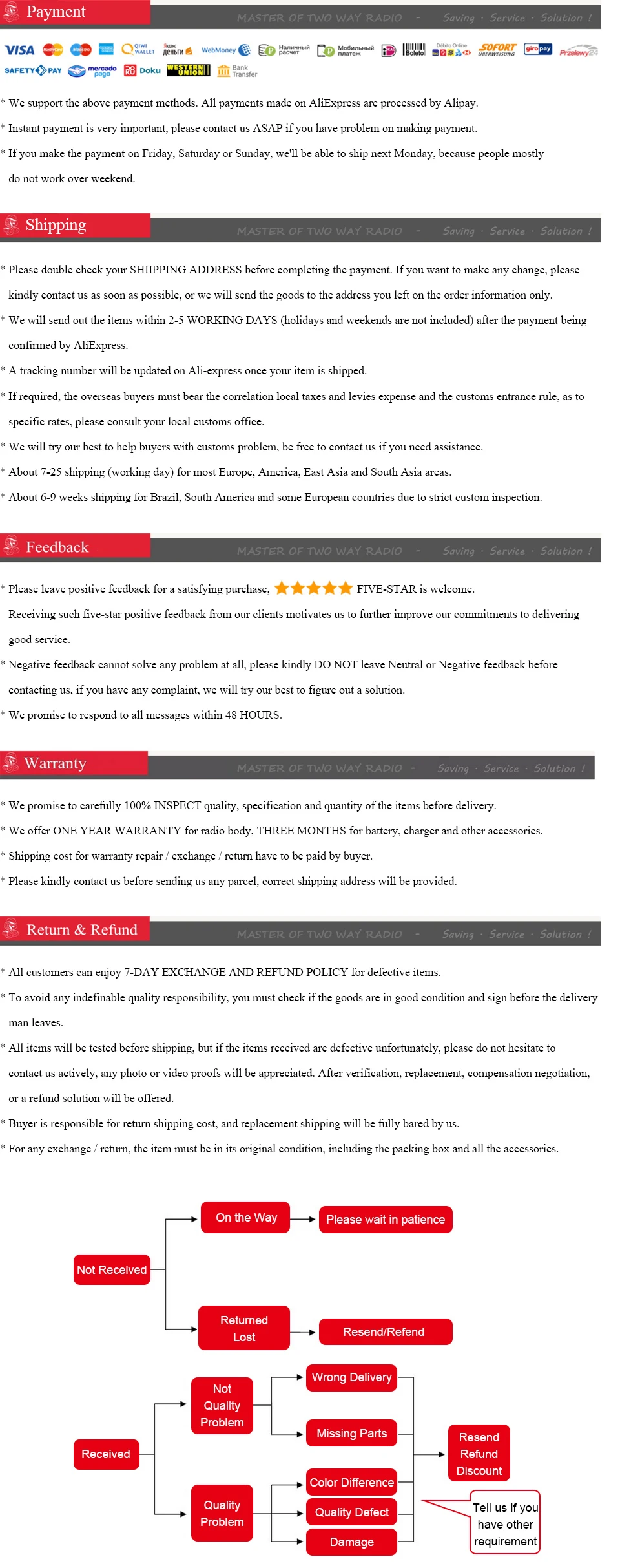 Все отлично, заказываю уже 3й раз, качество раций стабильно хорошее, без брака, при самой низкой цене, которую находил на али, даже без скидок. Единственный минус - каждый раз ооочень долгая доставка - по 2-3 месяца, к тому же посылки идут без отслеживания, что заставляет понервничать, но, повторюсь, в итоге всегда благополучно. Еще стоит отметить порядочность продавца - вежливый и всегда на связи, держит в курсе. P.S.: Как соберусь перепрошить - дополню отзыв.