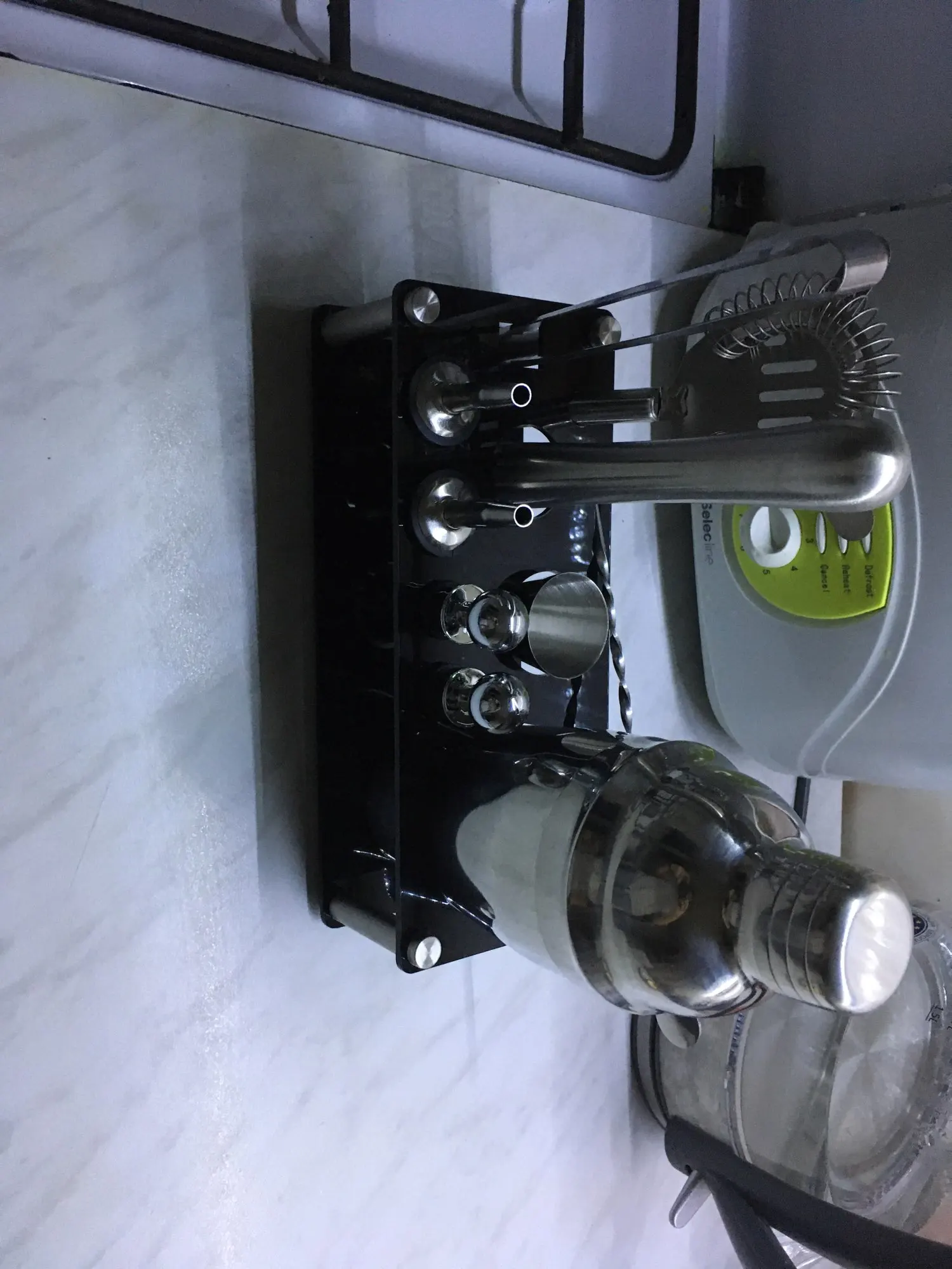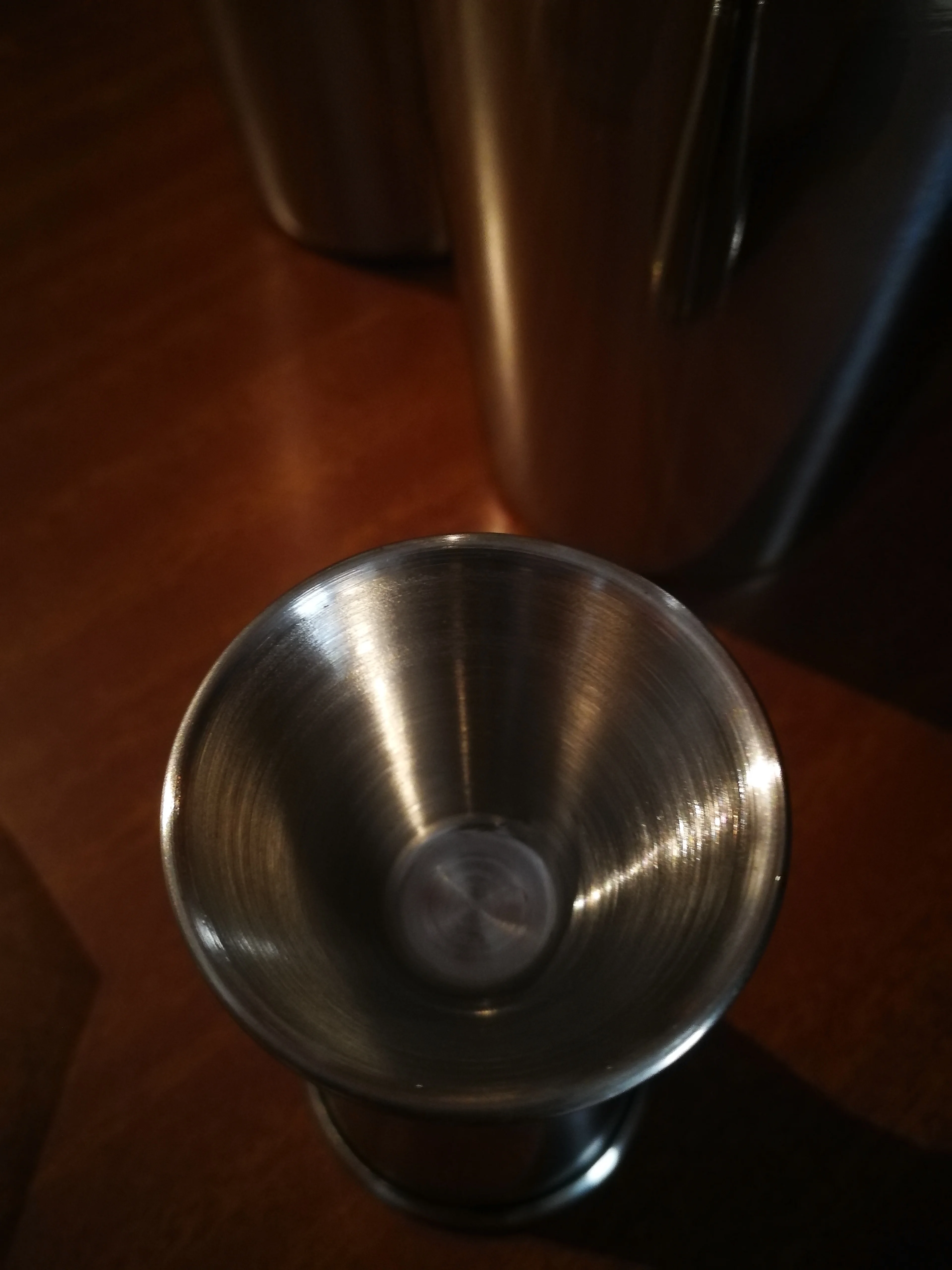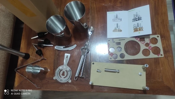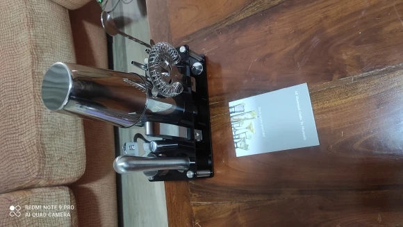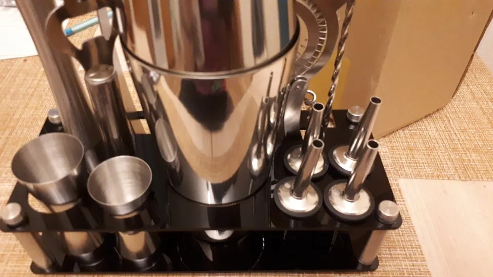 Пришло в мятой коробке, но все цело. Открывашка ужасная (но она не сильно нужна), джигер примерно 25/12,5 мл. Заусенуев на металле нет. Из минусов - плохо продумана подставка в части установки барной ложки - пятка упирается в одну из стоек самой подставки и стоит ровно только если на нее не дышать, в остальных случаях падает.