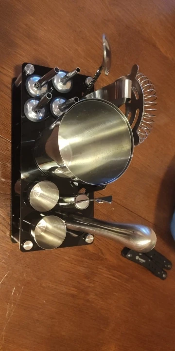 Шейкер бостонский топ, закрывается хорошо, правда неустойчиво стоит на стойке, но в целом все хорошо. Стрейнер идеально подогнан под шейкер. Ложка коротковата, хотелось бы подлиннее, заказал длинную отдельно, эта пойдёт только для укладки напитков слоями из-за наличия пятки. К мадлеру претензий нет. Вопросы вызывает только открывашка, но она не нужна. У джиггера объемы 10 и 25 мл