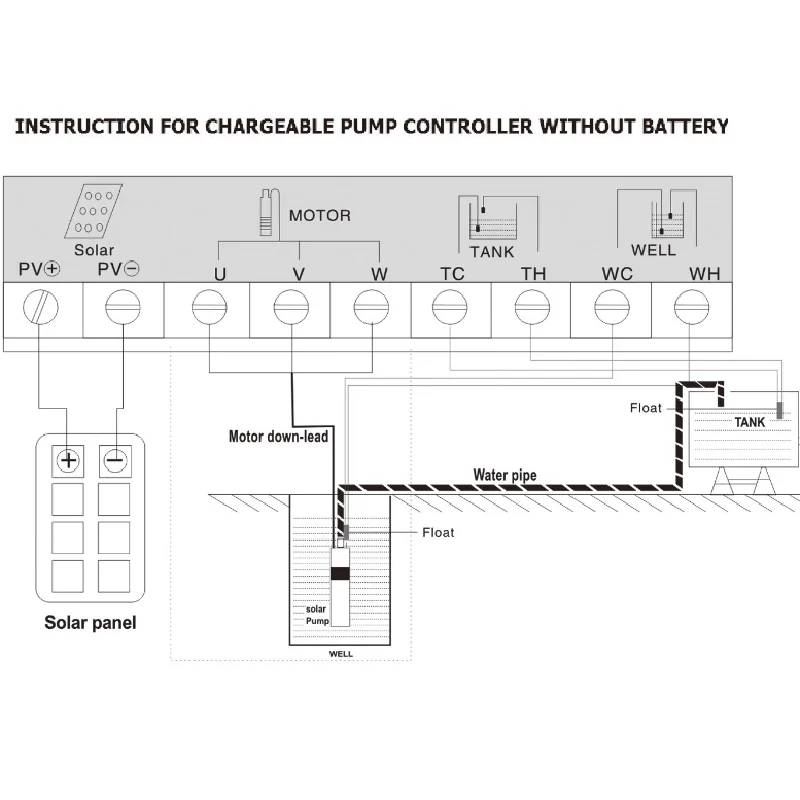 Подсоедините насос, панели к блоку управления согласно схеме подключения ниже. Как на насосе, так и на контроллере имеются маркировки «U», «V» и «W». Убедитесь, что подключены соответствующим образом и не соприкасаются друг с другом.