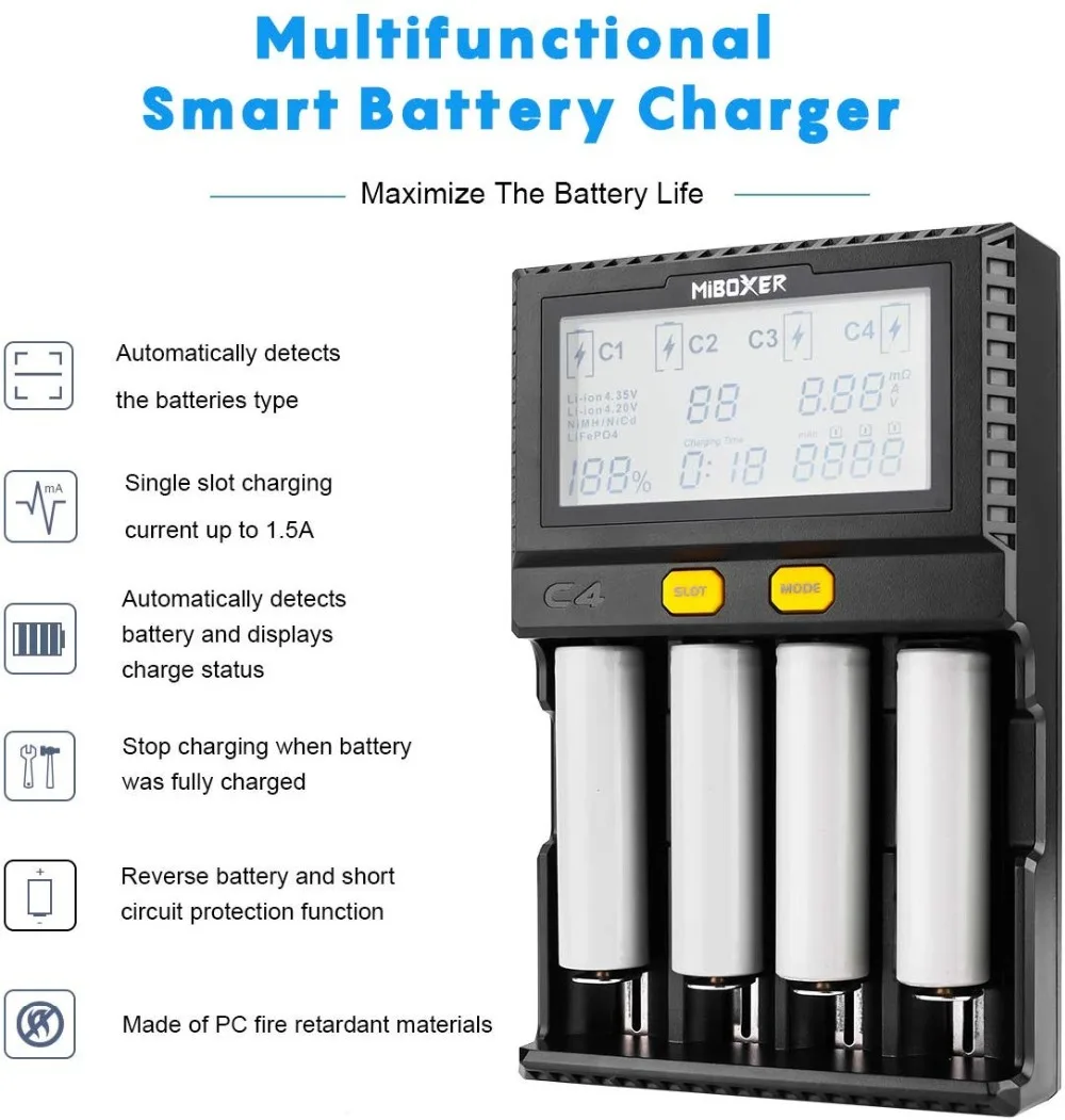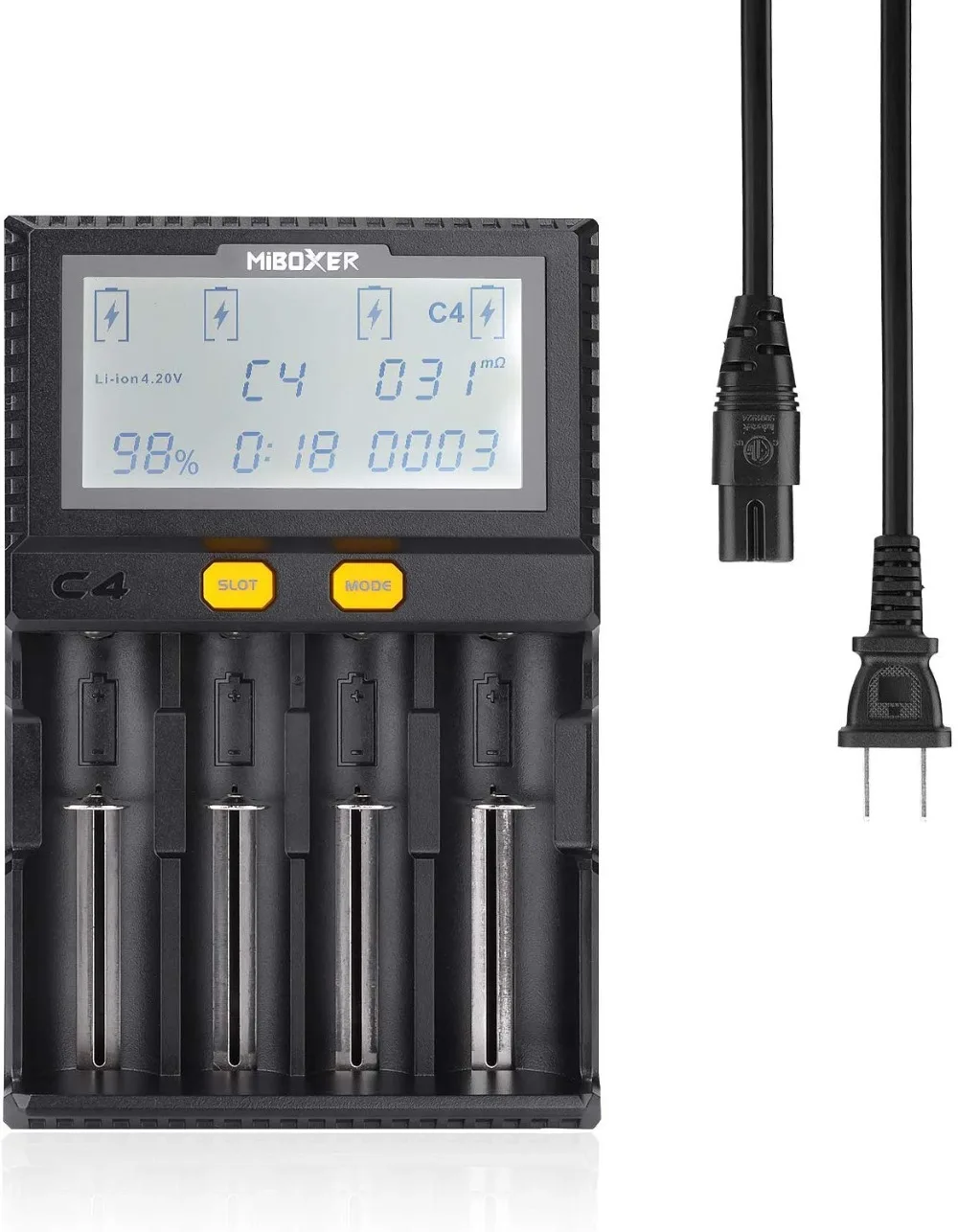 Брал на замену Liitokala lii-500 для зарядки акумуляторов 21700. В lii-500 их тоже можно заряжать, но влазят они с трудом, и на контактах остаются вмятины, и одновременно можно запихать только 2 аккумулятора. В этом заряднике 21700 помещаются с хорошим запасом, 4 штуки одновременно вообще легко помещаются. Описание немного устарело, в последней версии c4 можно заряжать одновременно 4 аккума с максимальным током 1 А, по 1.3 если 3 аккума и если один, то 1.5 А. Блока питания в комплекте нет, вернее есть, но он встроенный, устройство подключается напрямую от сети, при этом есть гнездо для 12-вольтового БП, если подключить через блок питания от lii-500, то работает.