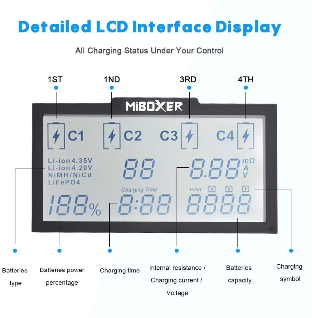 Умное зарядное устройство Miboxer C4 с ЖК-дисплеем для Li-Ion IMR ICR LiFePO4 18650 14500 26650 AAA 21700-100 мАч 800 а 1,2 в разряд