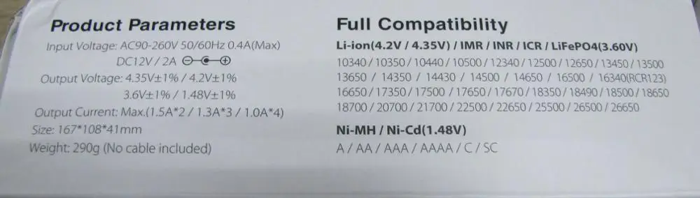 Всё соответствует описанию. Просто информация: инструкции на русском языке нет, вкладыша для мелких аккумуляторов тоже нет, четвертый слот работает. Продавцом доволен, сделал всё оперативно.