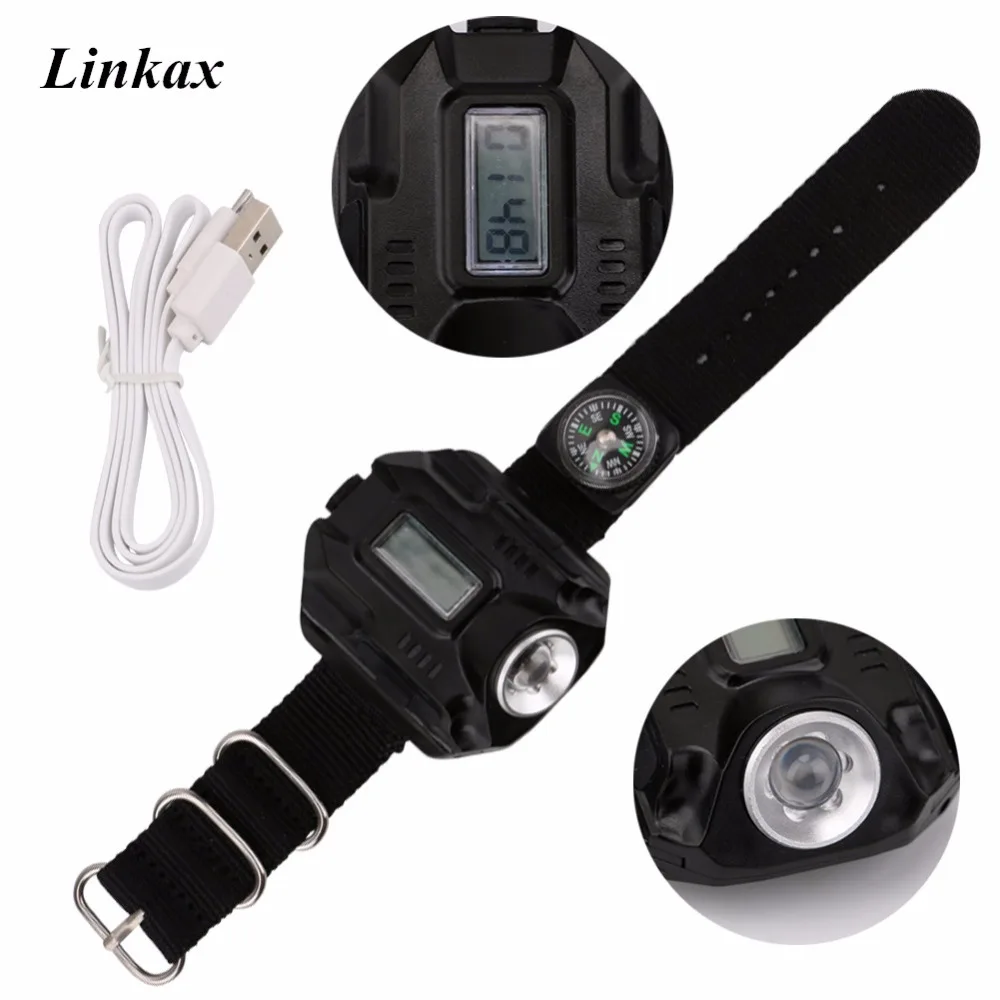 Светодиодный наручные часы вспышки светильник фонарь светильник XPE R2 USB Перезаряжаемые светодиодный тактический вспышки светильник часы лампа с Wirstband + usb кабель