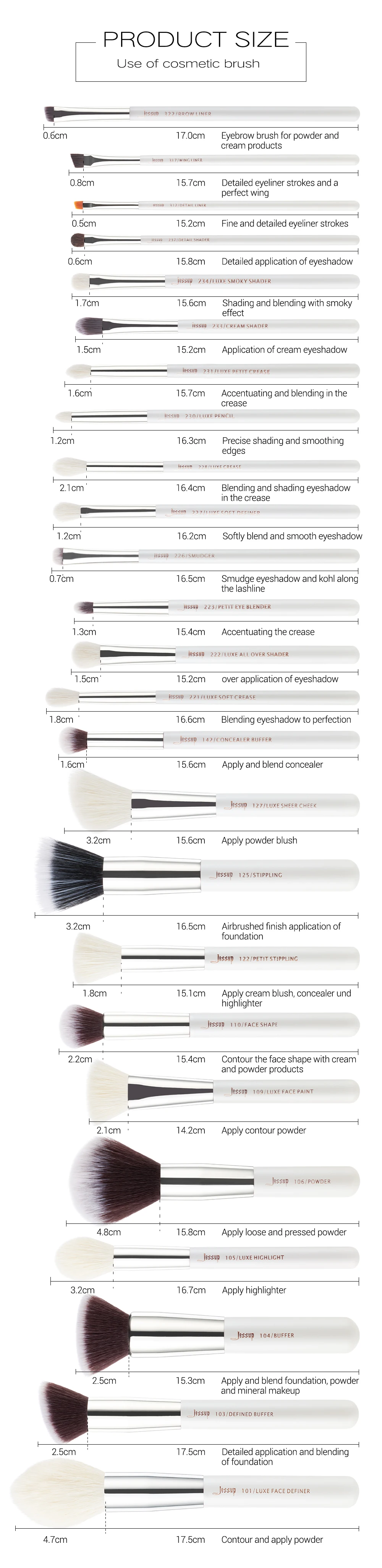 1.Ворс: Патентные, Cмешанные Натуральные и Синтетические Волосы Традиционная Ручная Работа Эластичный, Мягкий и Шелковистый, Плотный Сильная Способность Схватывать Сухие Текстуры 2.Ручка: Древесина Березы с 7-кратным Покрытием Роскошный Жемчужно-Белый Подходящий Вес Эргономичная, Удобная в Использовании 3.Муфта: Тонкая Металлическая Муфта Цвета Серебро Очень Прочная